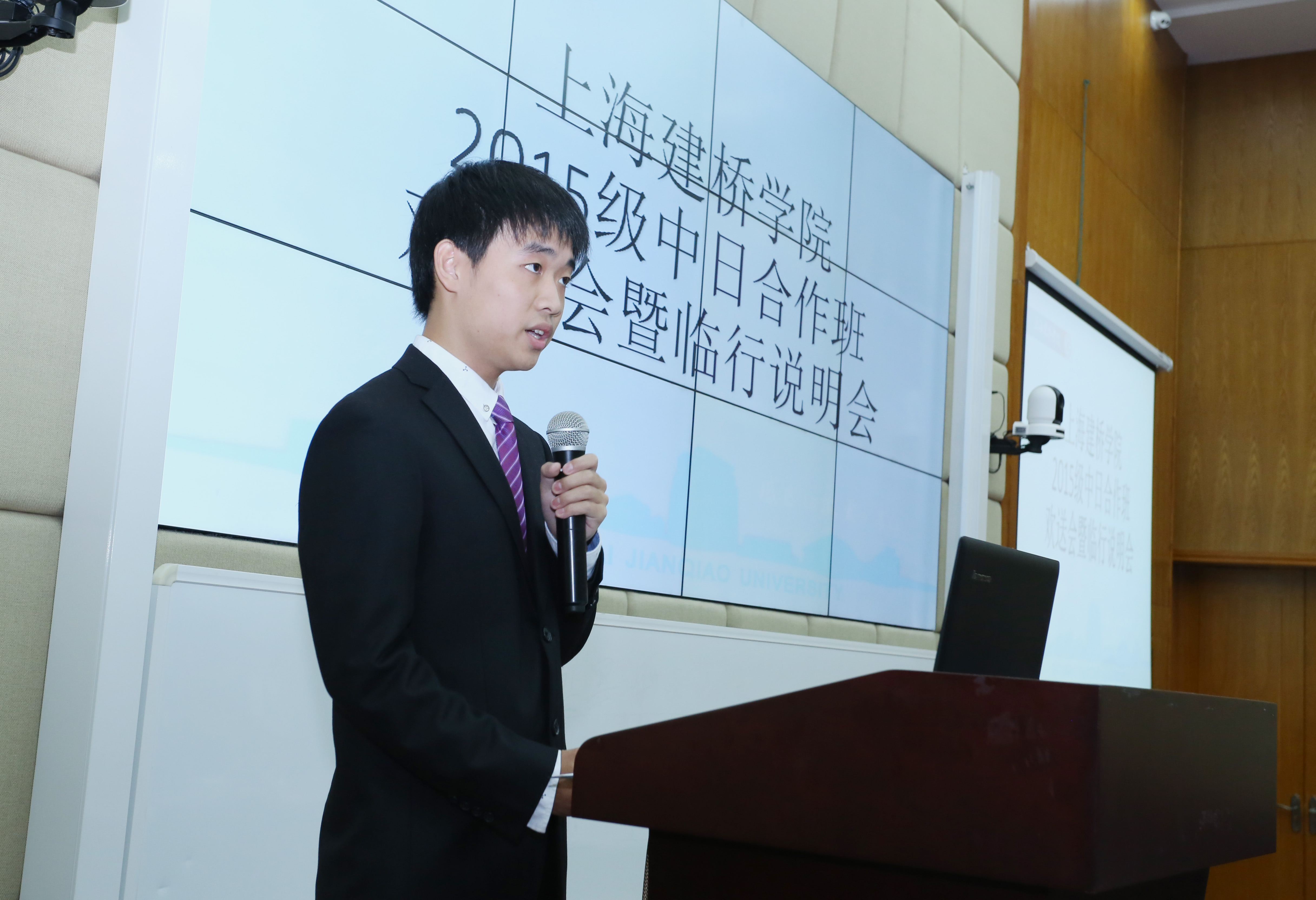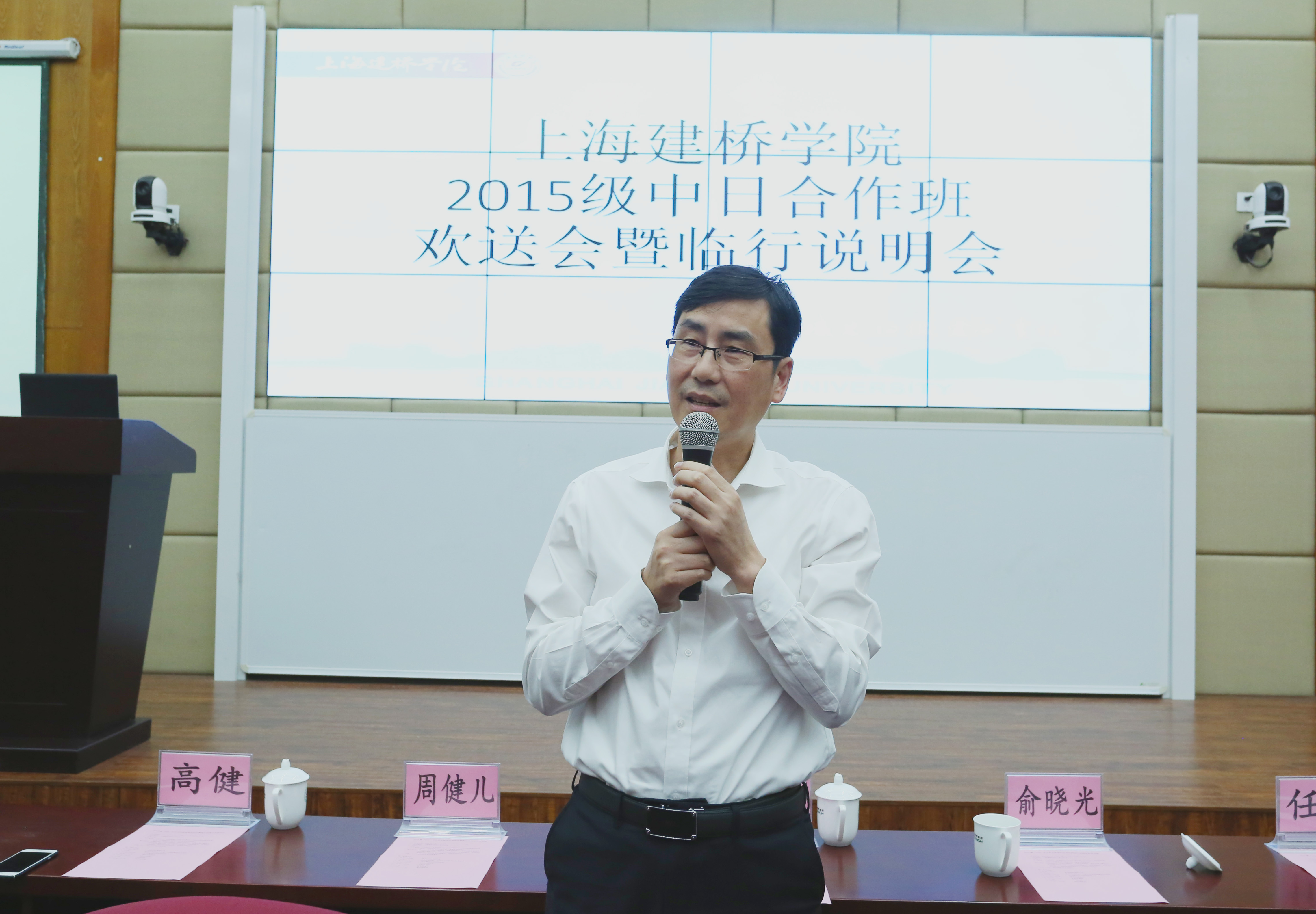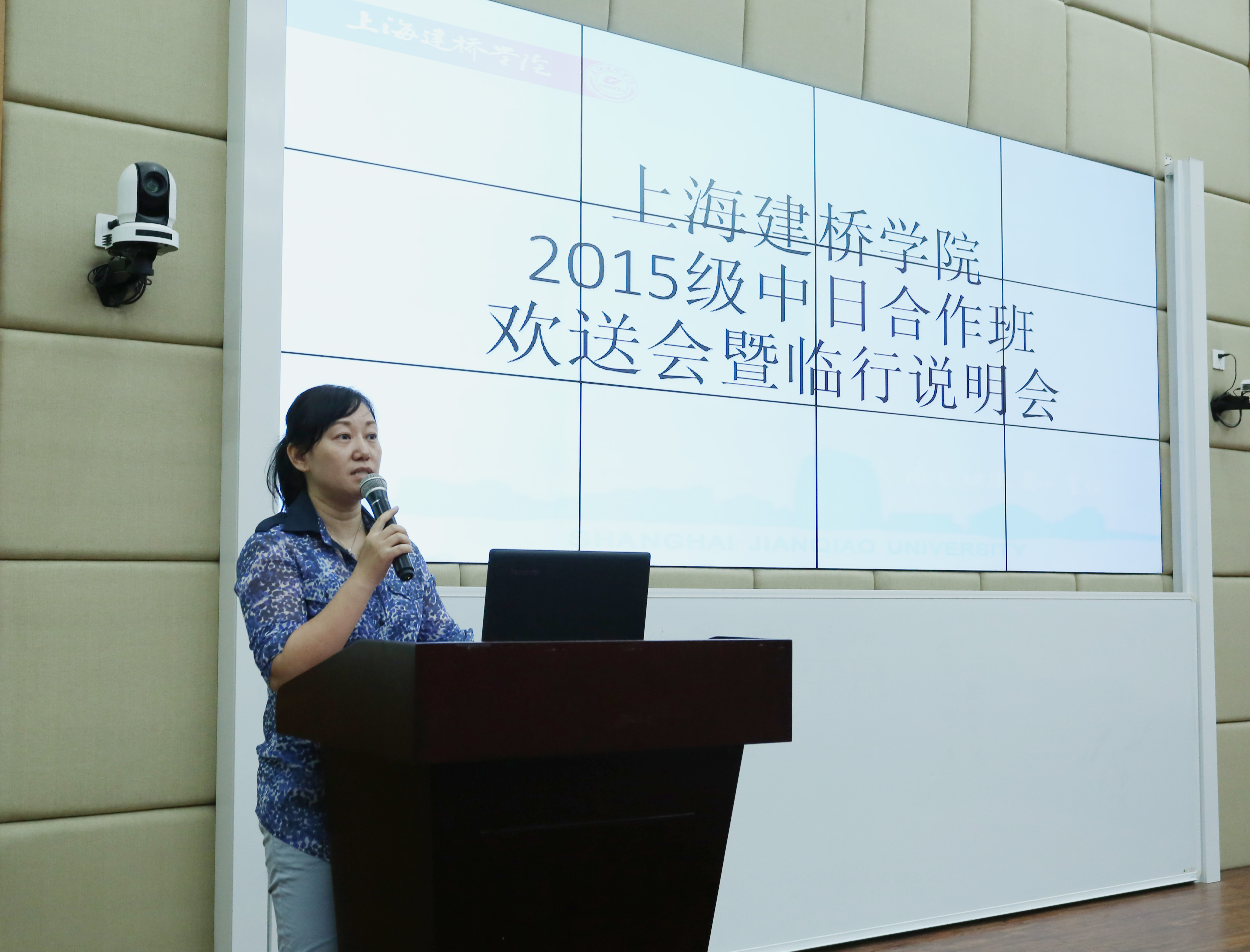 9月11日下午,我校2015级中日合作班欢送会暨临行说明会在三教222举行。校长朱瑞庭出席了本次欢送会并致辞,与会出席的还有副校长俞晓光、日方嘉宾京都情报大学院大学上海事务所所长任兵老师、商学院院长高健、外国语学院院长吕乐、职业技术学院院长焦庆堂、信息技术学院党总支书记张巍、艺术学院副院长葛洪波、对外交流办公室副主任梁月泉。会议由职业技术学院商务日语系主任刘潇滢老师主持。