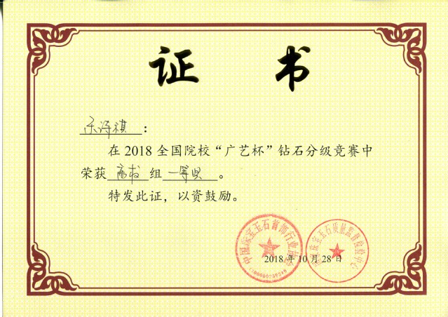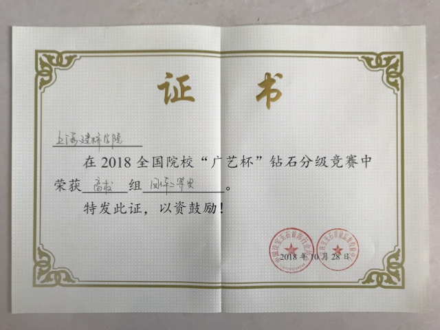10月27日上午,我校珠宝学院学生在2018年全国高校广艺杯钻石分级竞赛中获得佳绩,获一等奖一项、个人优秀奖一项、团队二等奖一项,这是我校在国家级宝玉石鉴定专业竞赛上的新突破。