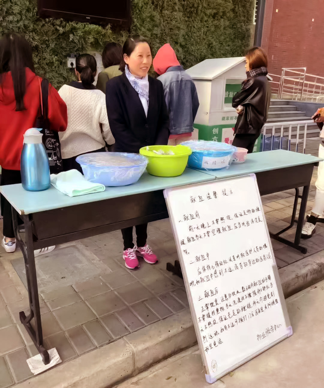 为了更好地服务参与献血的同学,暖心的社区阿姨们还为献血的同学们准备了红枣等补血物品,并在宿舍门口用小黑板写了献血的温馨提示。