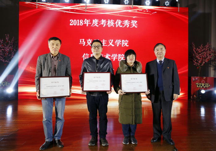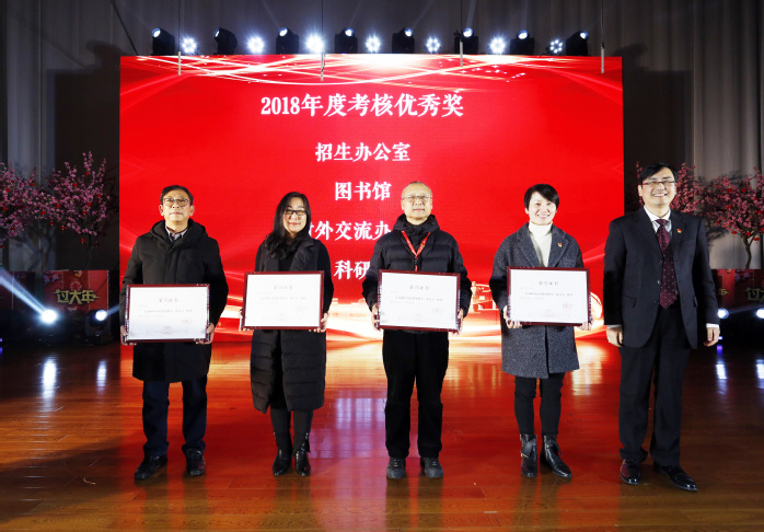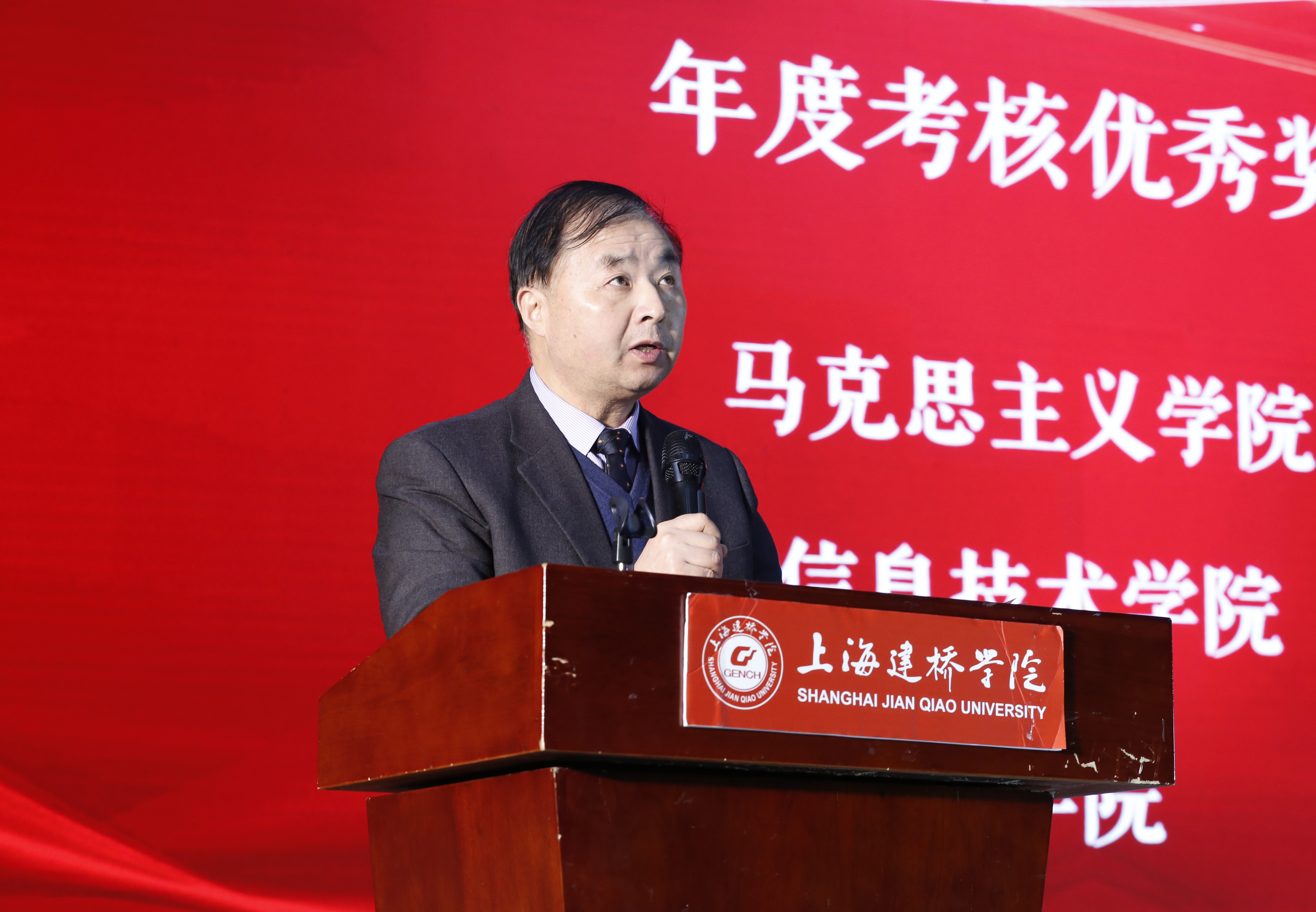 党委书记江彦桥宣读了2018年度考核优秀二级单位、优秀教职工(清云奖)、优秀系主任、优秀教学奖、优秀辅导员获奖名单。校领导分别为获奖个人、集体代表颁奖。会议现场发布了上海建桥学院2018年十大新闻。