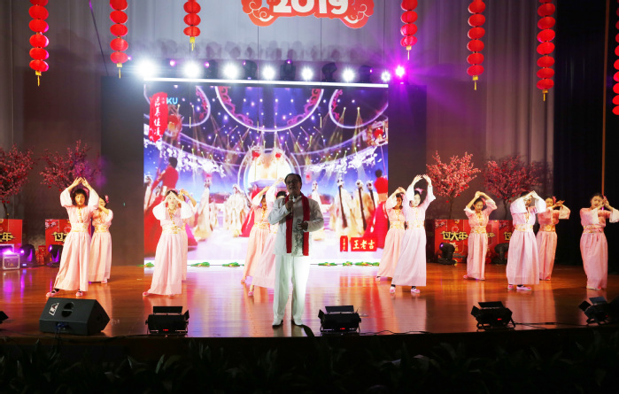 联欢会伊始,一曲小合唱《年轻的朋友来相会》引起了全场教职工的共鸣,合唱团邀请校领导一起登上舞台中央,歌唱建桥大家庭