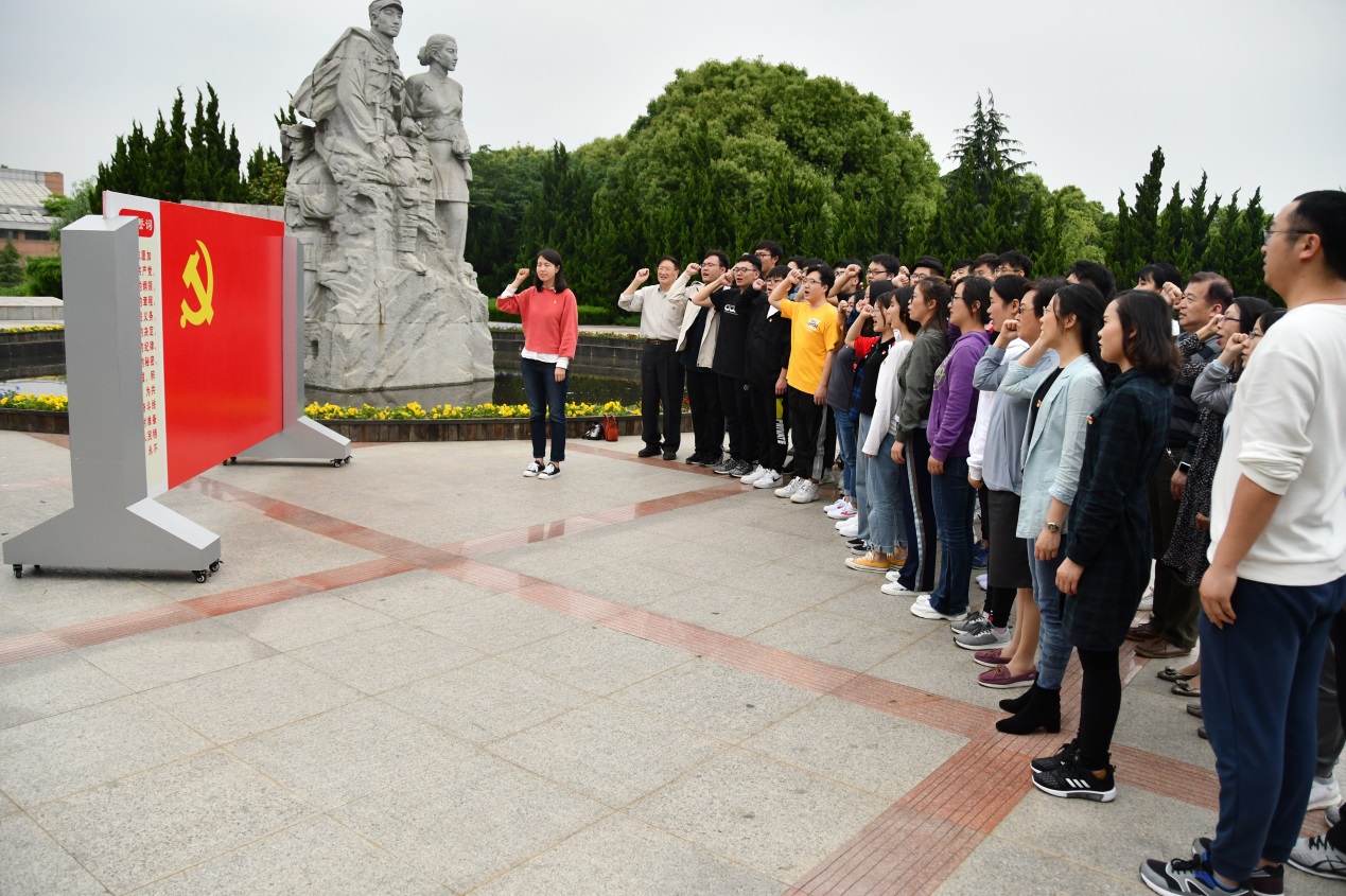 [学院党总支副书记杜鹃(左前)带领师生重温入党誓词]