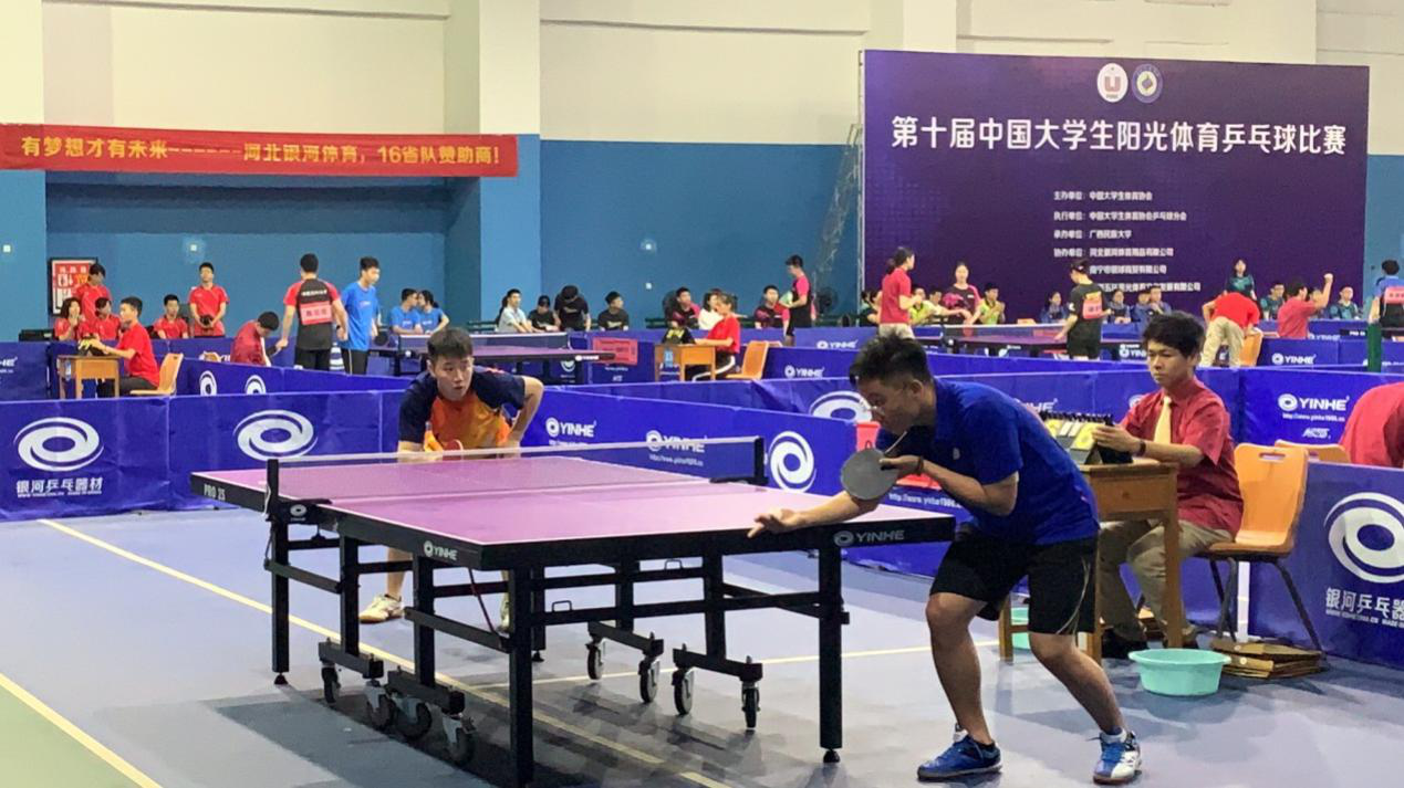 6月1至2日,第十届中国大学生阳光体育乒乓球比赛在广西民族大学体育馆举行。本届比赛由中国大体协主办,来自全国各地的32个高校参加这次比赛。