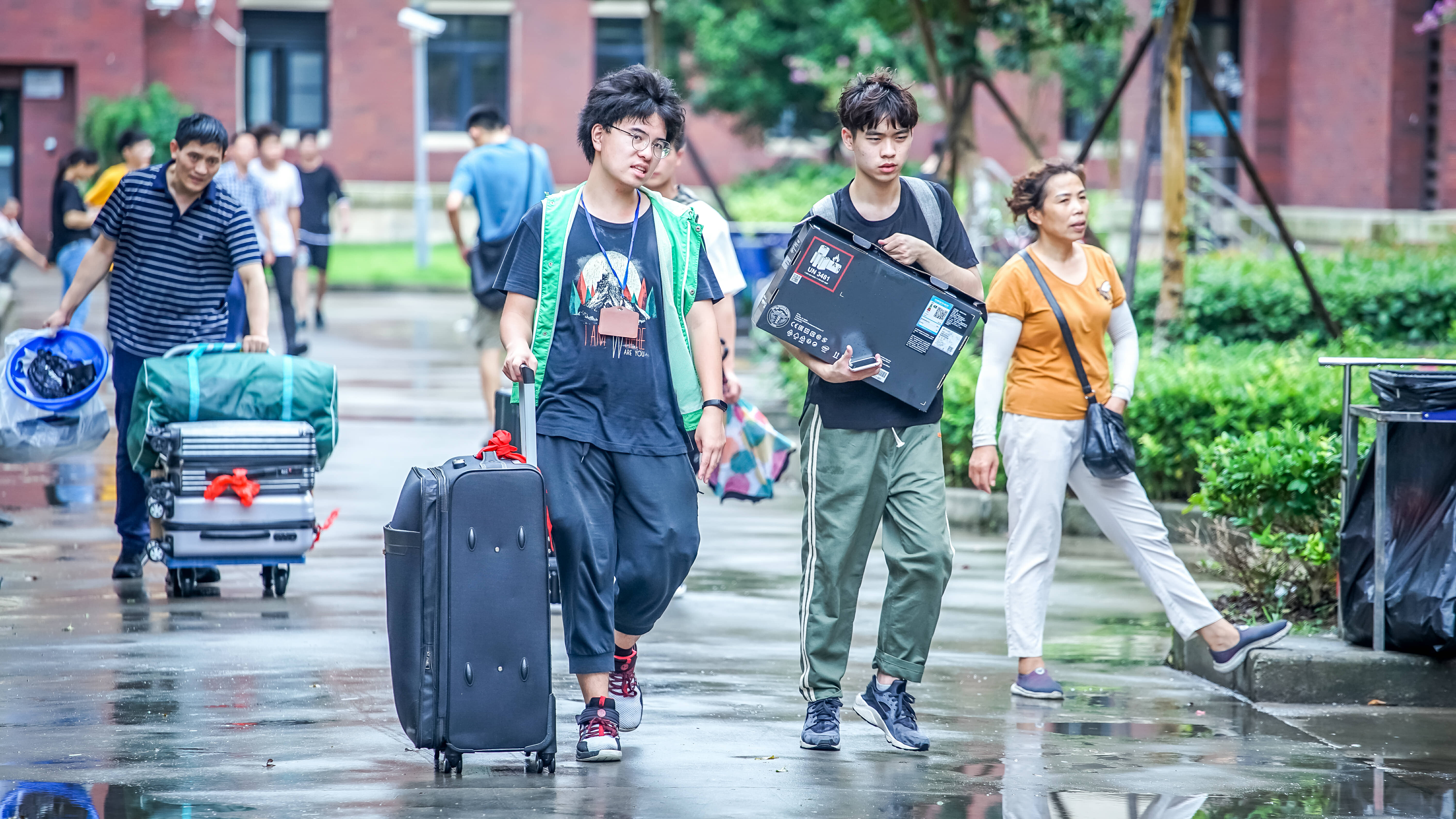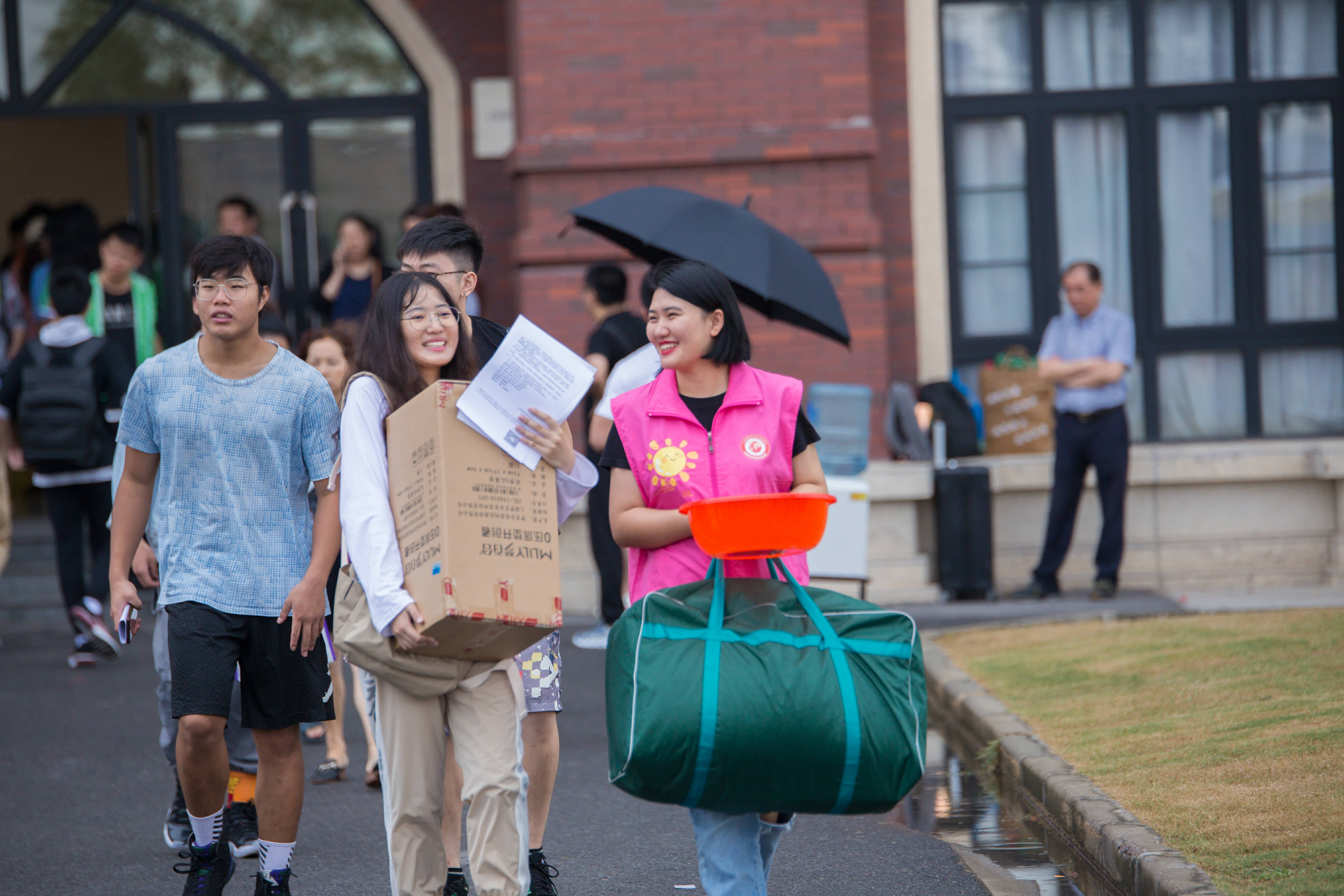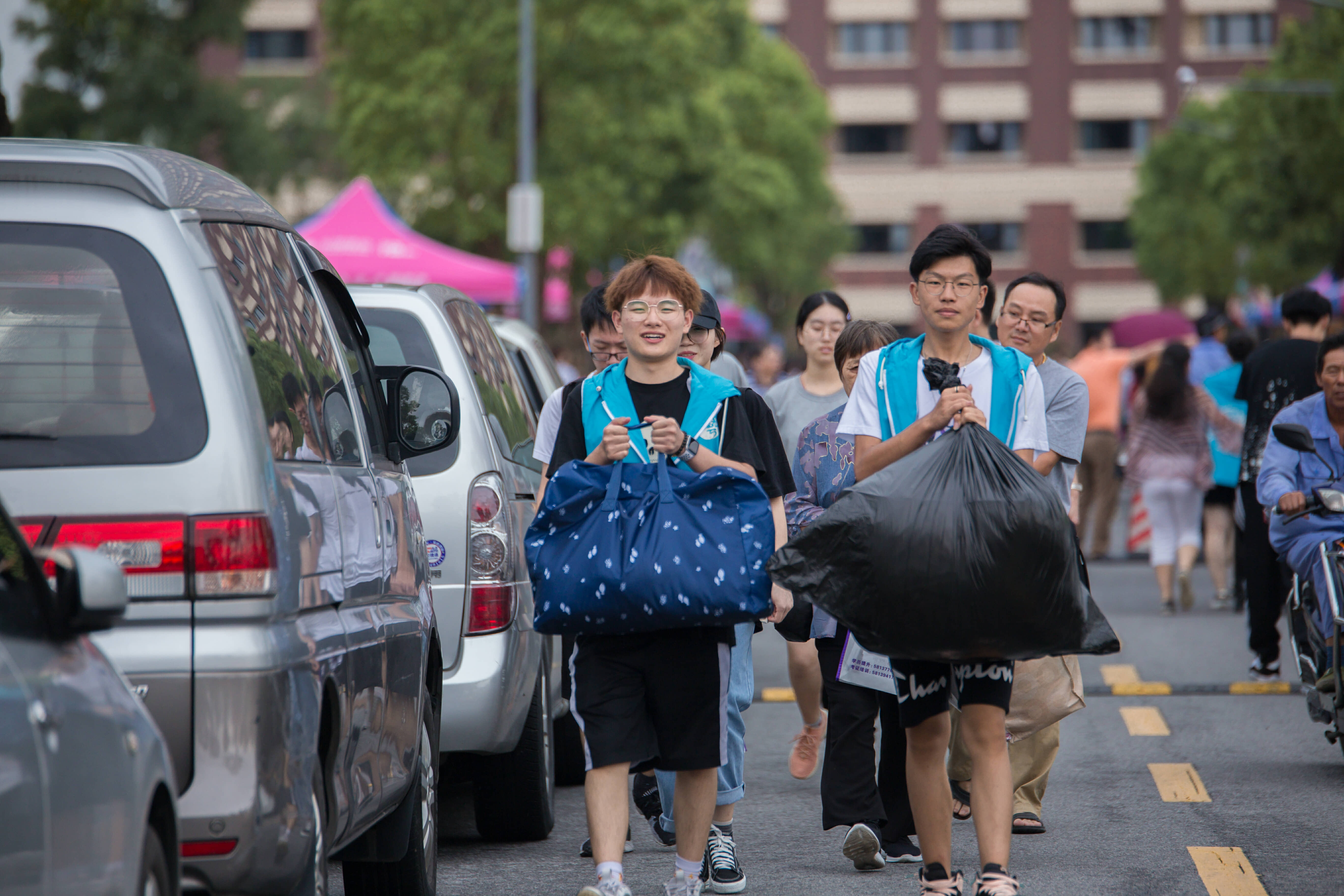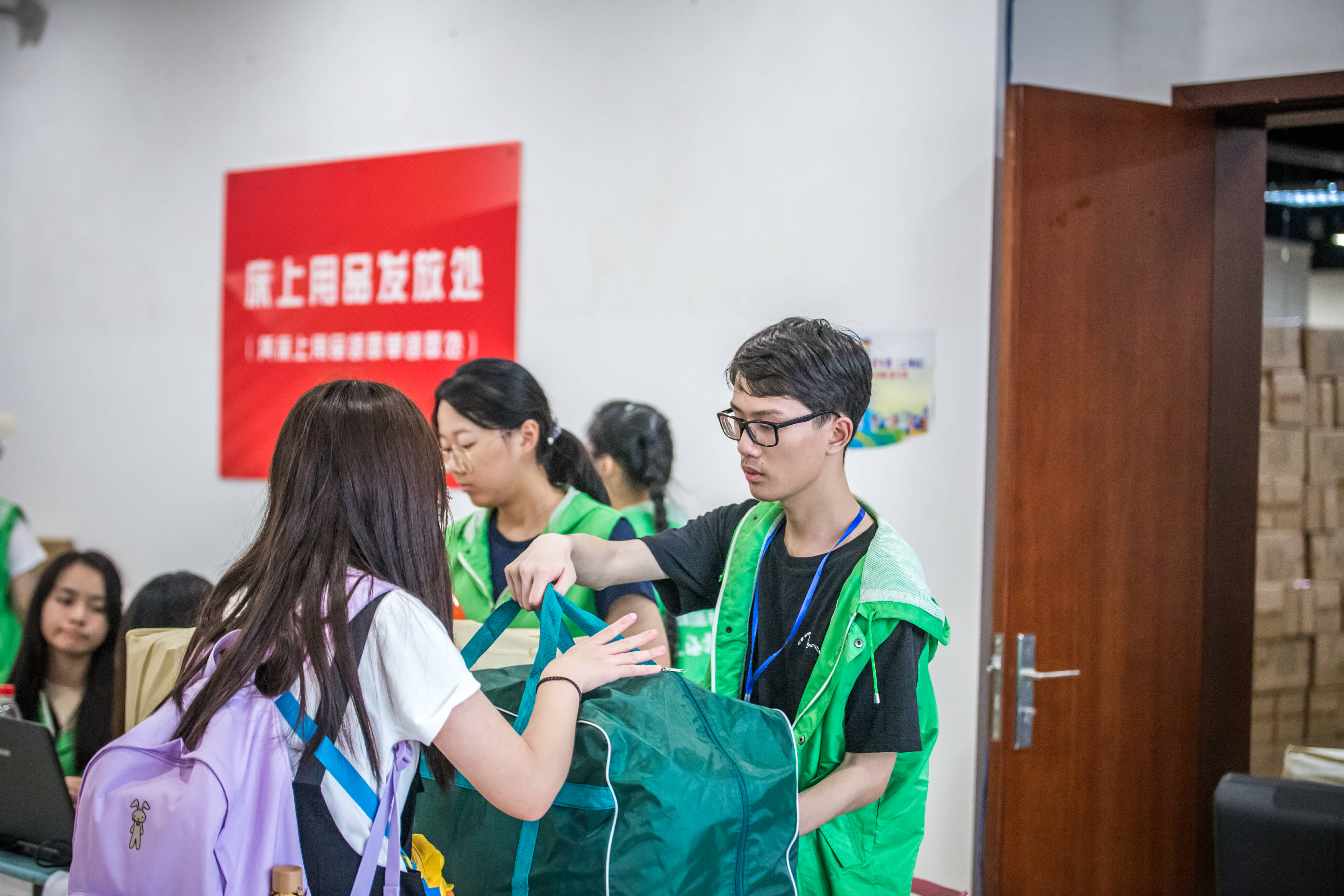 在烈日及大雨中,场外志愿者为新生及家长指路、解答疑问、就餐指引、帮拎行李等,场内志愿者则详细指导新生独立完成报到,协助领取生活用品等,虽然下午5点是他们的“下岗”时间,但是还有不少志愿者忙碌到晚间10点,通过热情接待传递学长学姐的关爱。