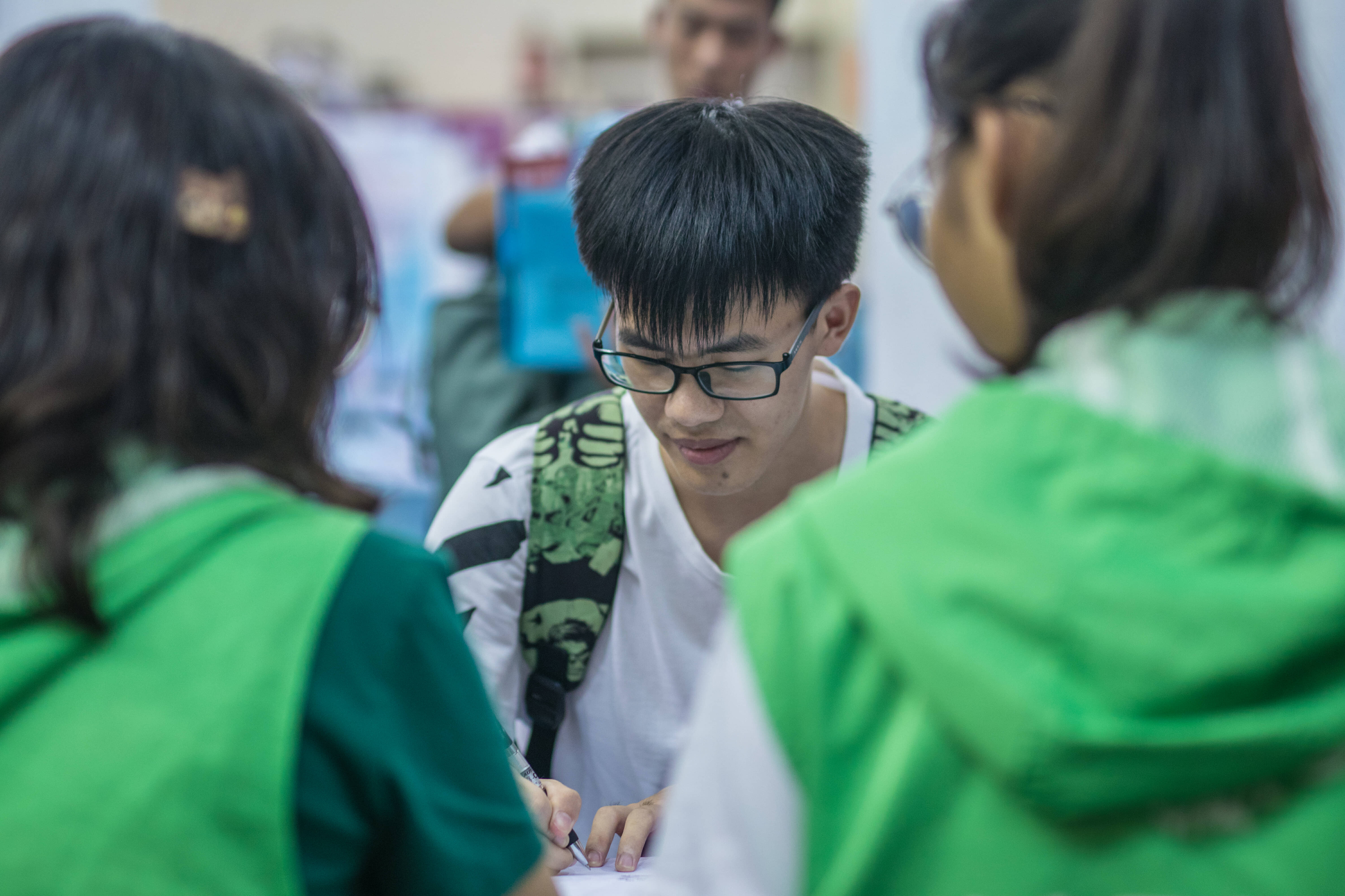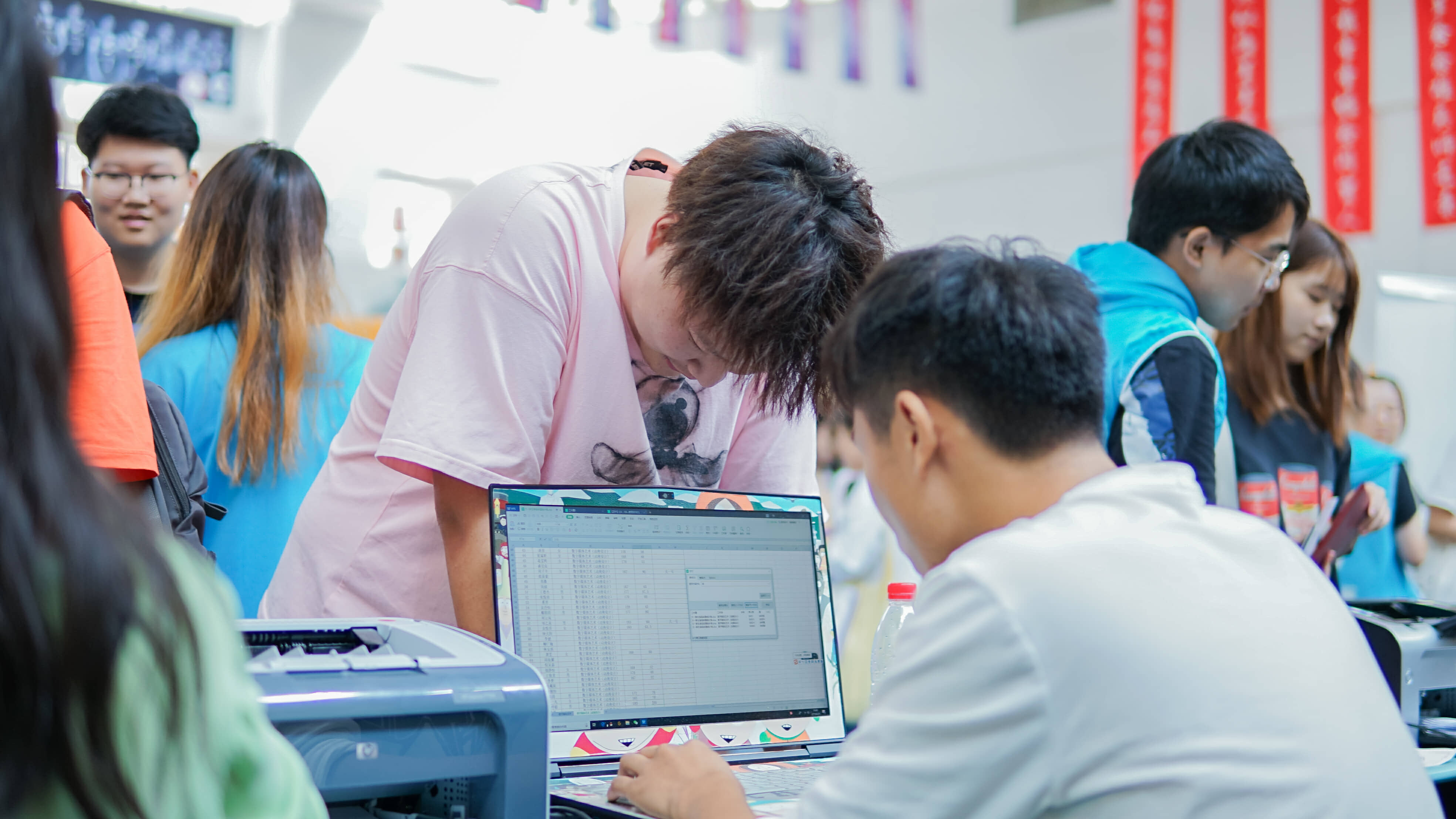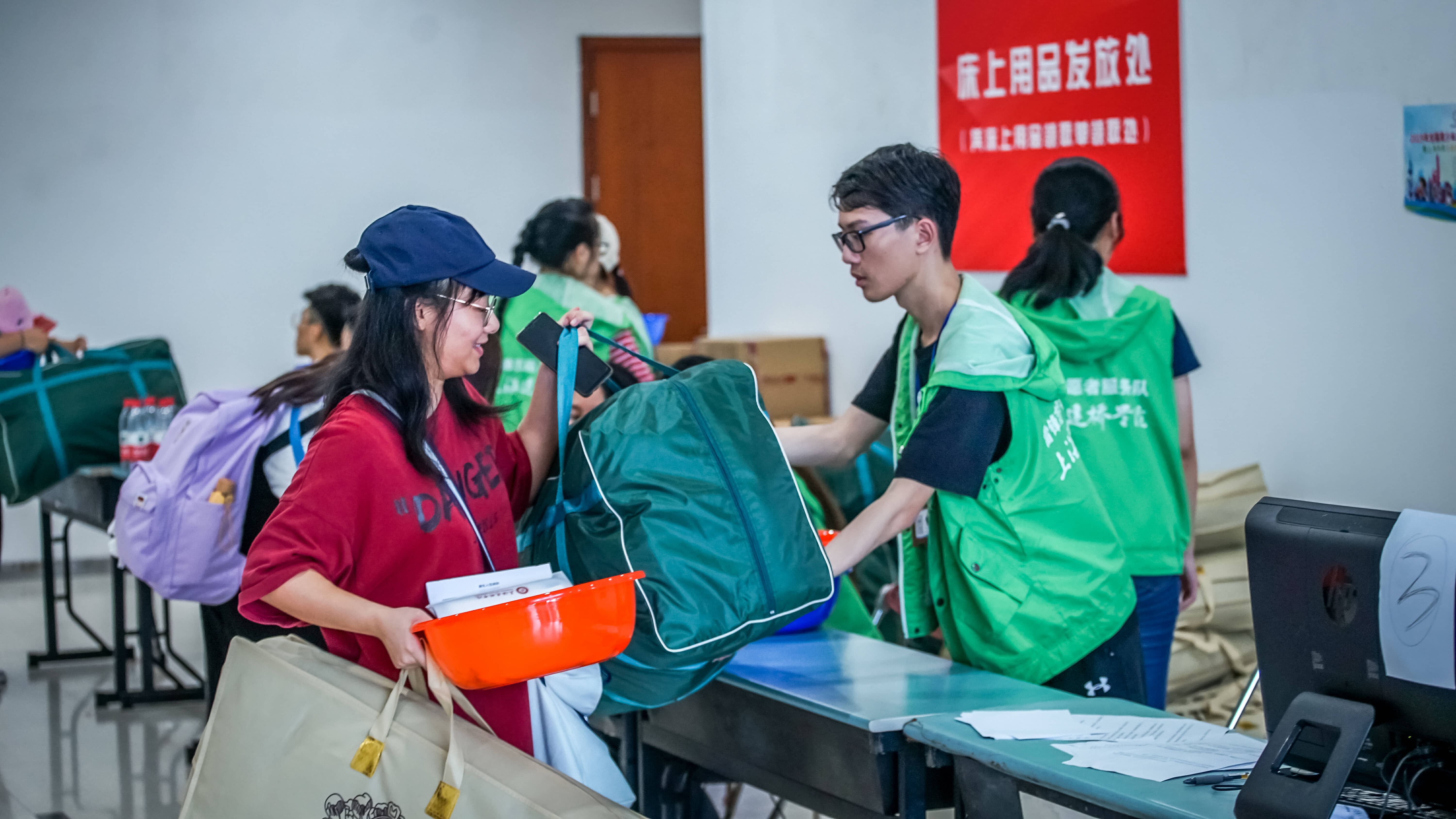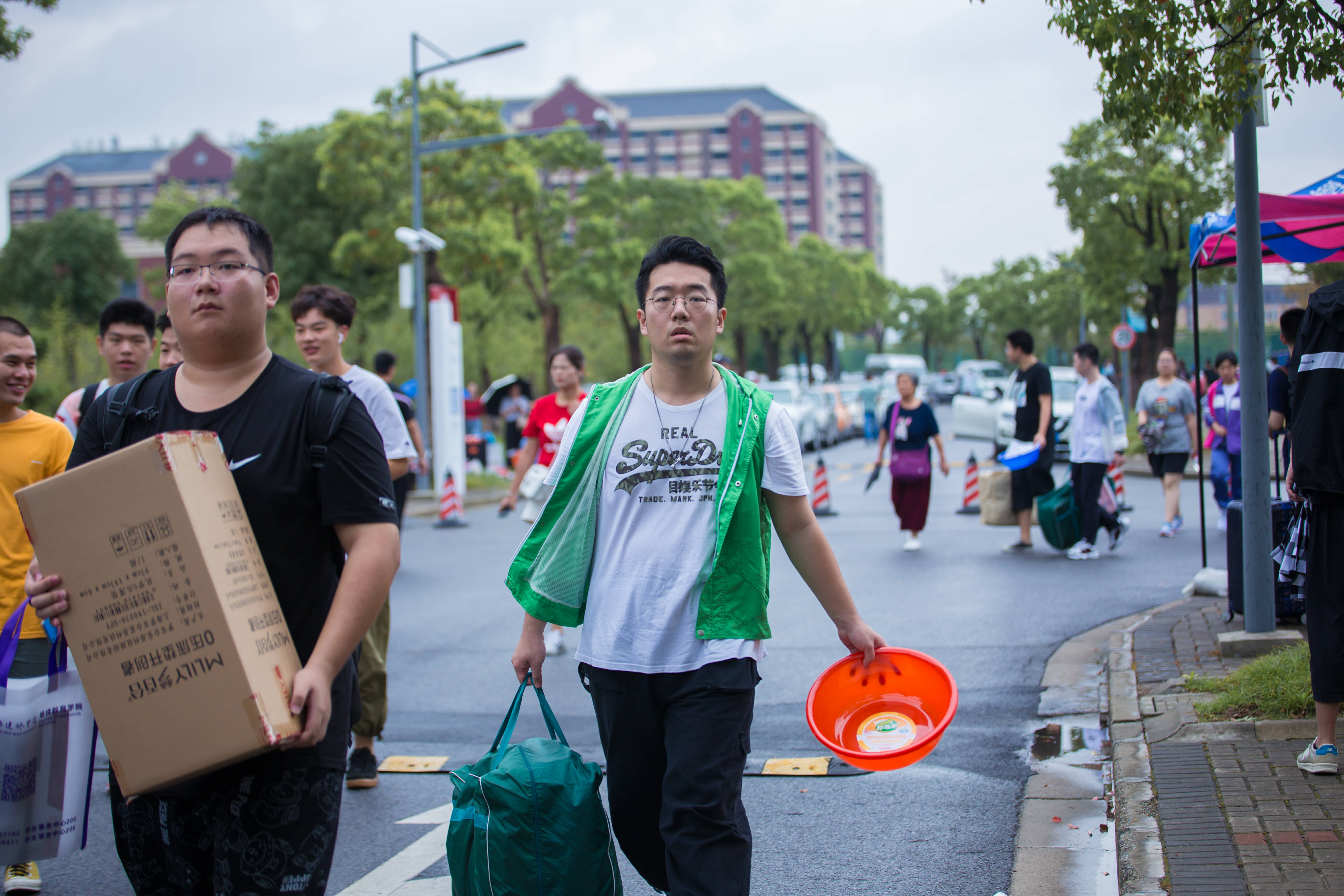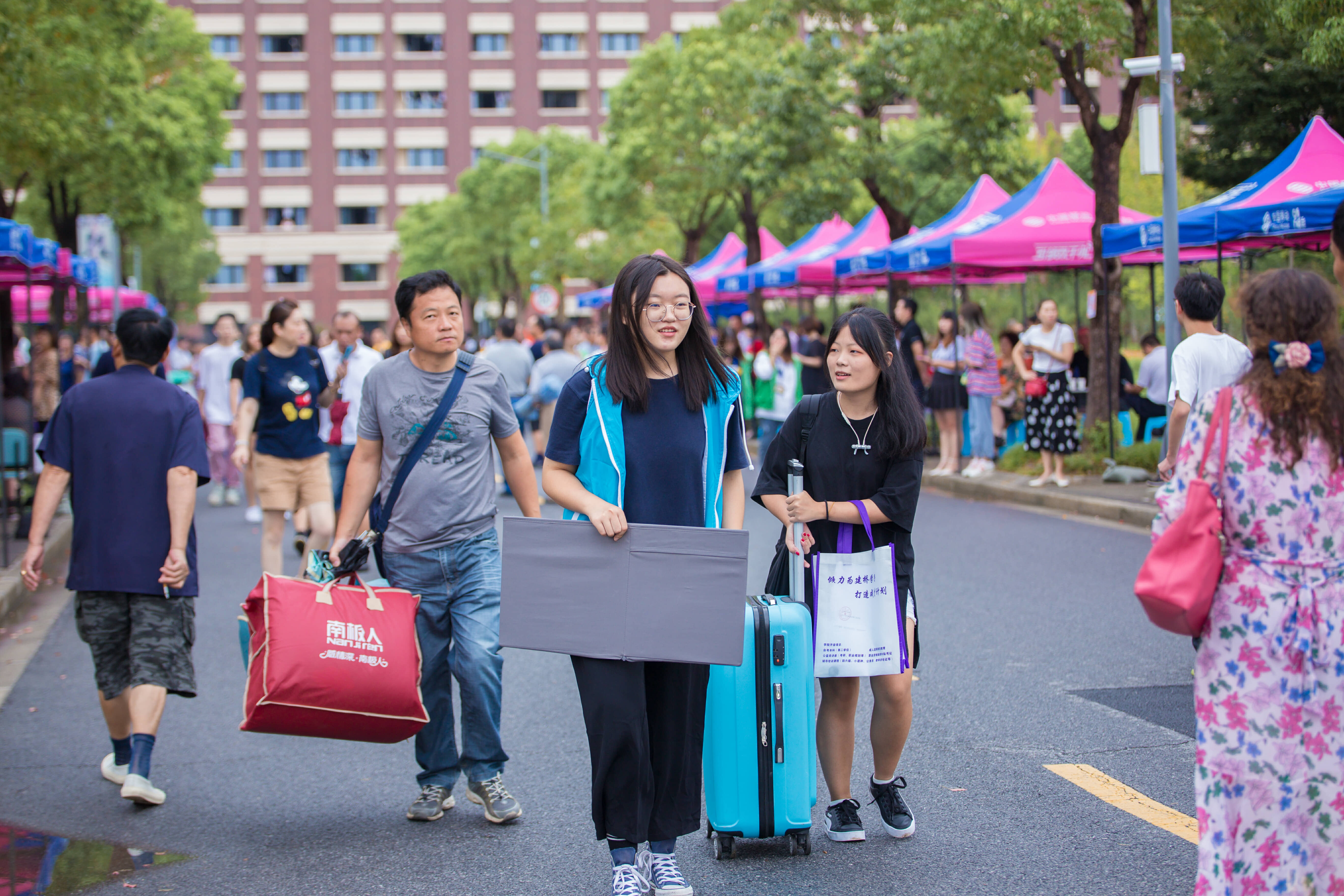 在烈日及大雨中,场外志愿者为新生及家长指路、解答疑问、就餐指引、帮拎行李等,场内志愿者则详细指导新生独立完成报到,协助领取生活用品等,虽然下午5点是他们的“下岗”时间,但是还有不少志愿者忙碌到晚间10点,通过热情接待传递学长学姐的关爱。