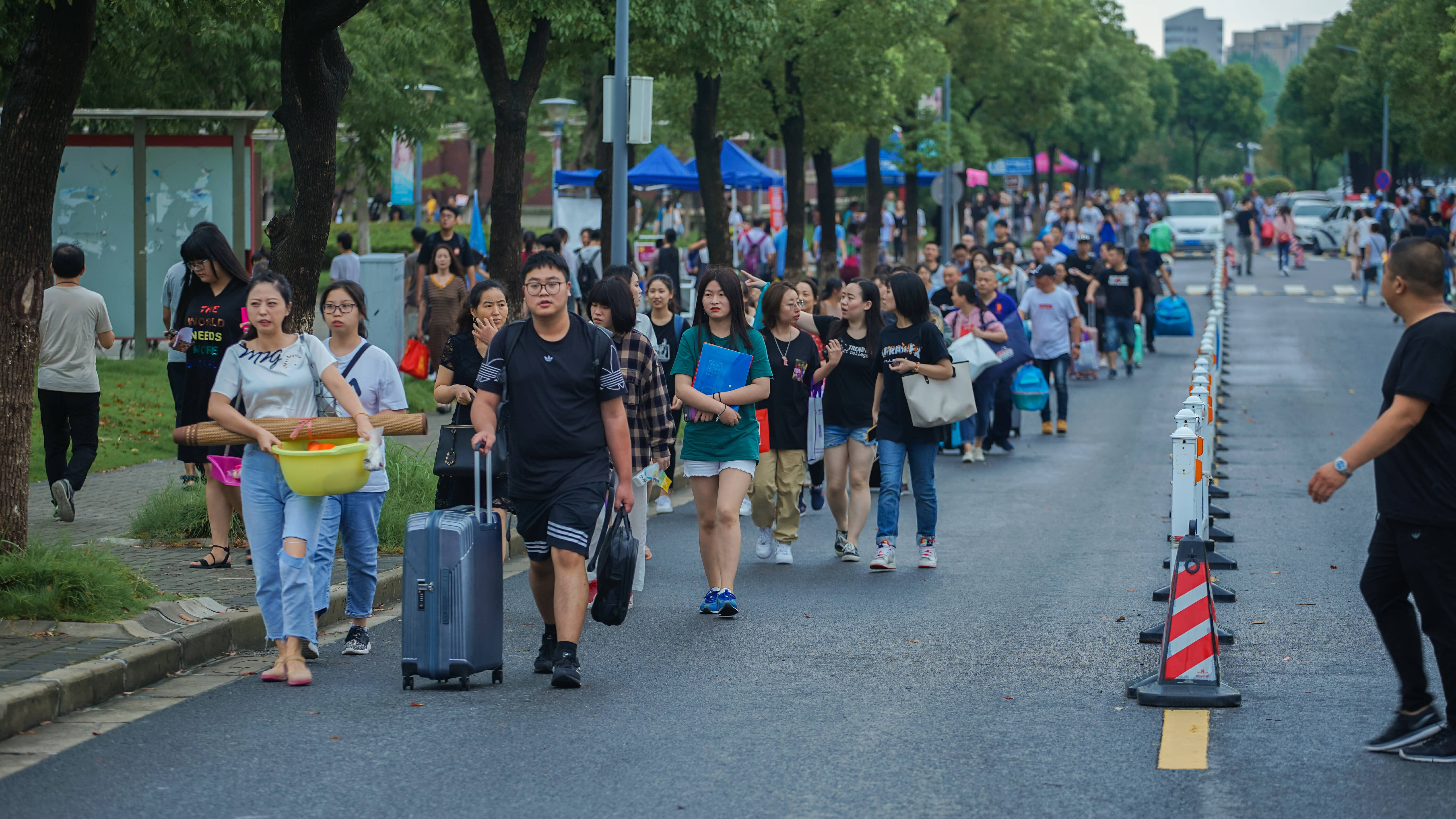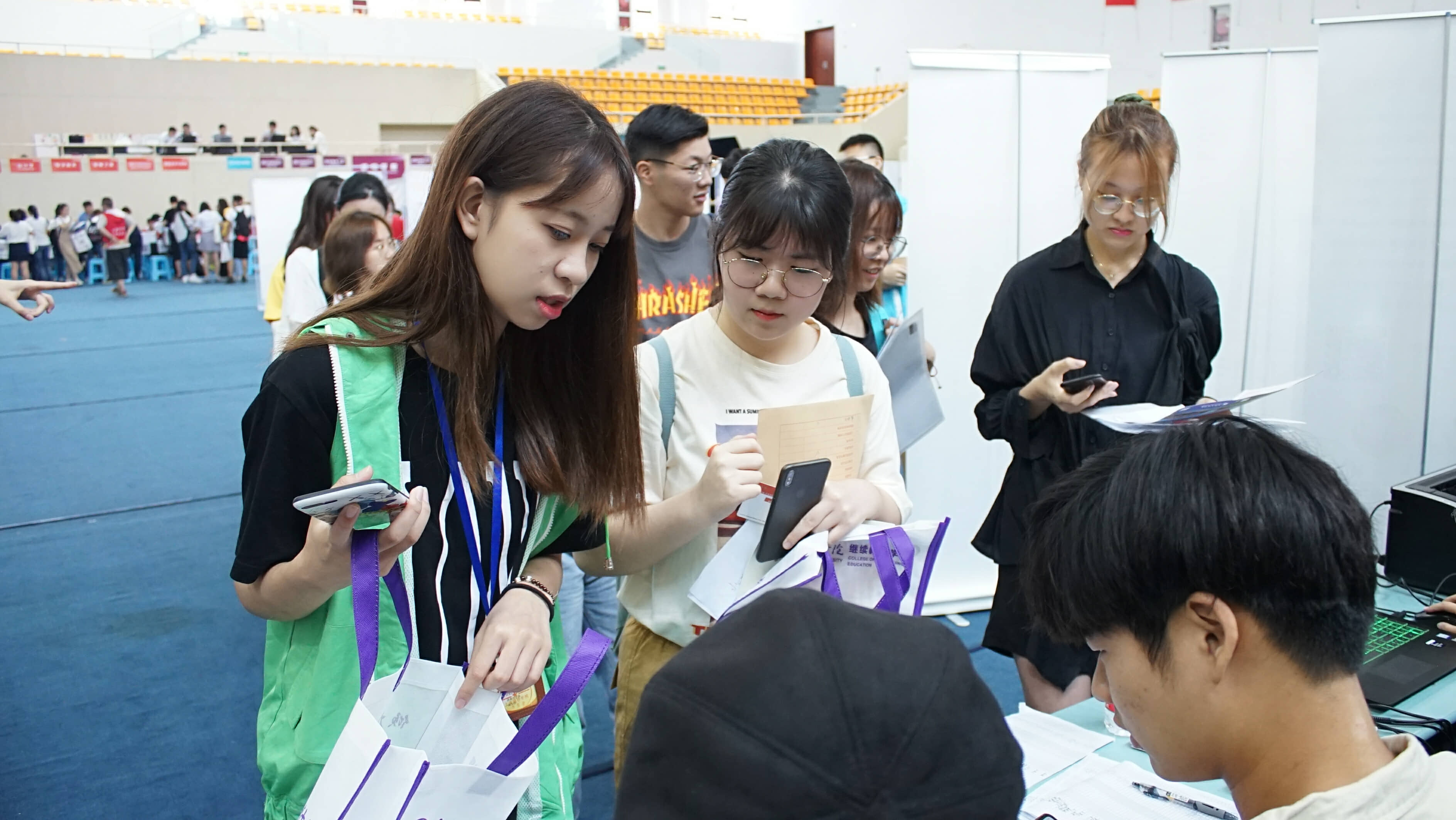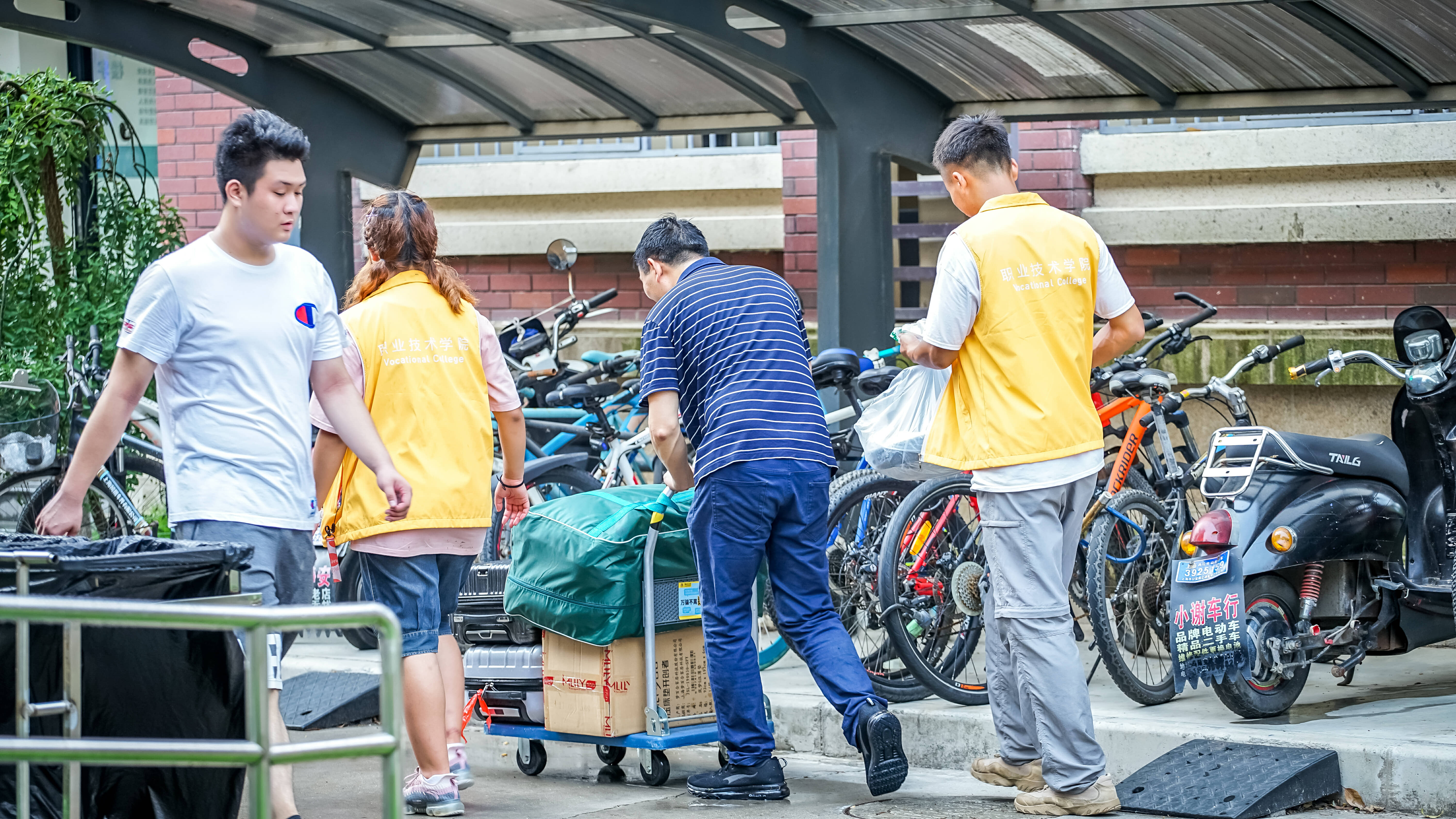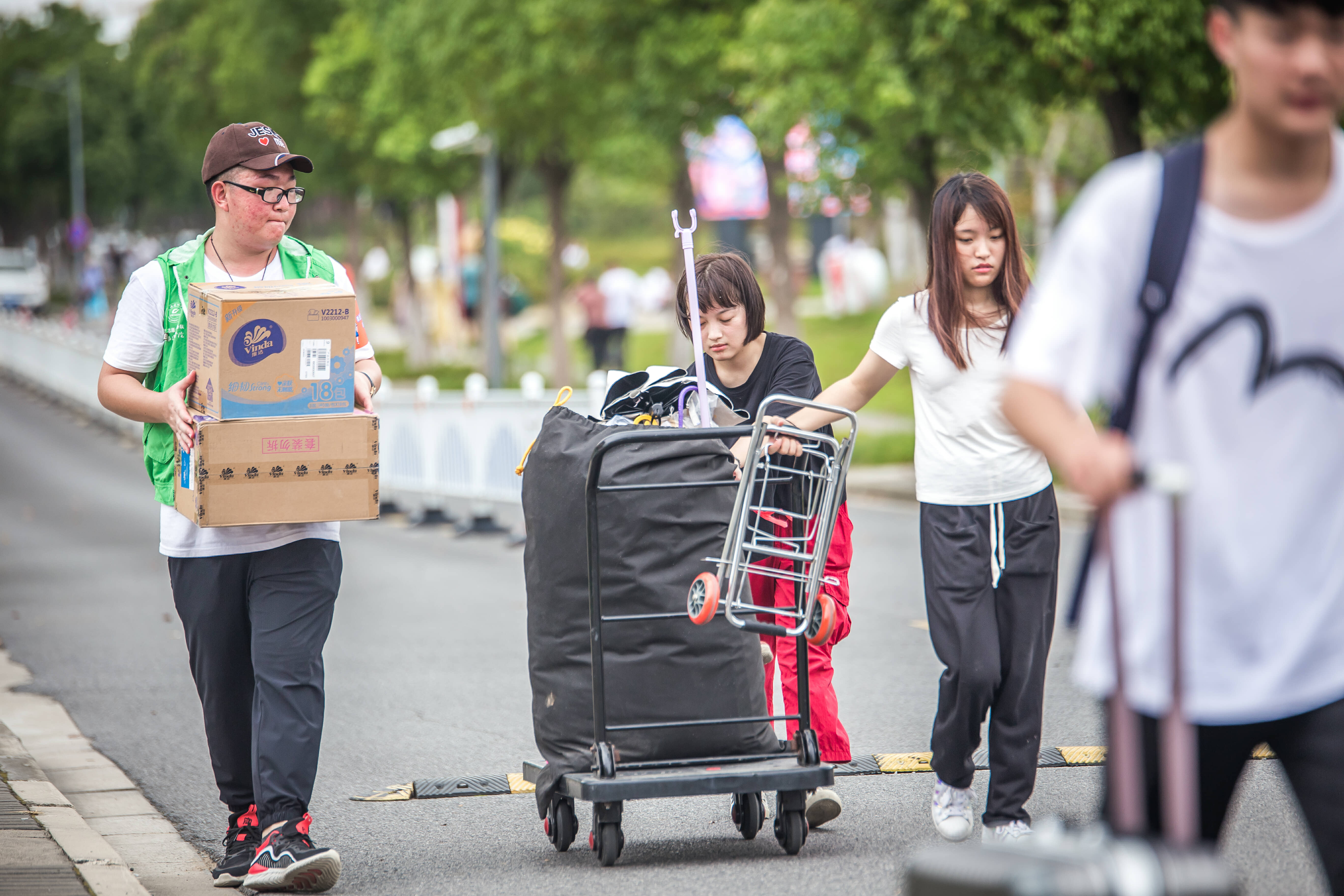 从校外到校内,从报到处到宿舍,穿着各色马甲的志愿者成了穿梭在迎新现场“最靓的仔”。早上7点,由150余名校团委志愿者、百余名二级学院志愿者组成的精干队伍,便开始忙碌而有序接待。