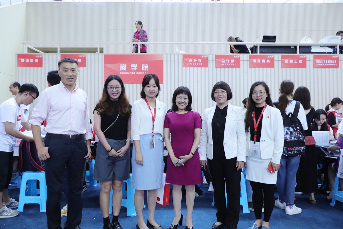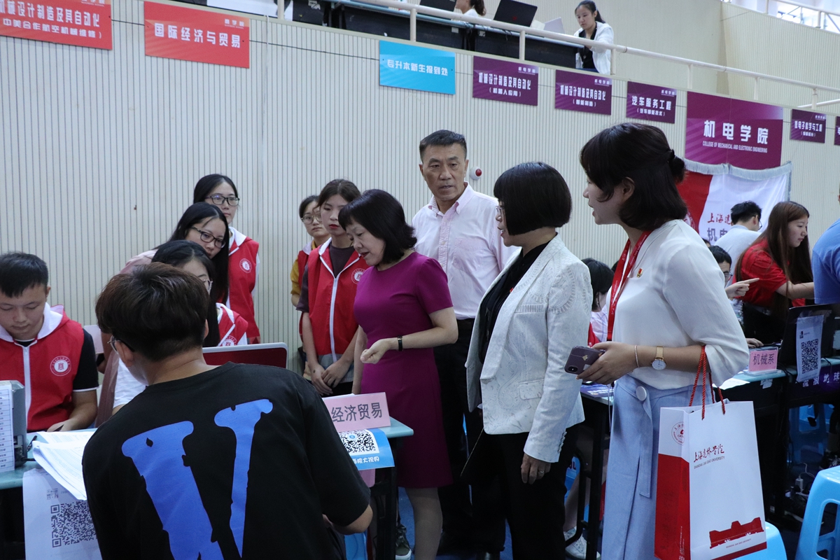 一大早,商学院院长高健、党总支书记刘爱香、副院长周英芬、副书记王晨岑等来到现场,巡视迎新情况,督阵指挥,了解报到情况。各位迎新工作老师也精神饱满,与家长亲切交流,讲解学院概况、专业设置,迎新工作井然有序。在报到当天,学院领导第一时间到新生宿舍查看了学生入住情况,与学生家长、新生沟通。商院上下同心协力,为“新”而动。