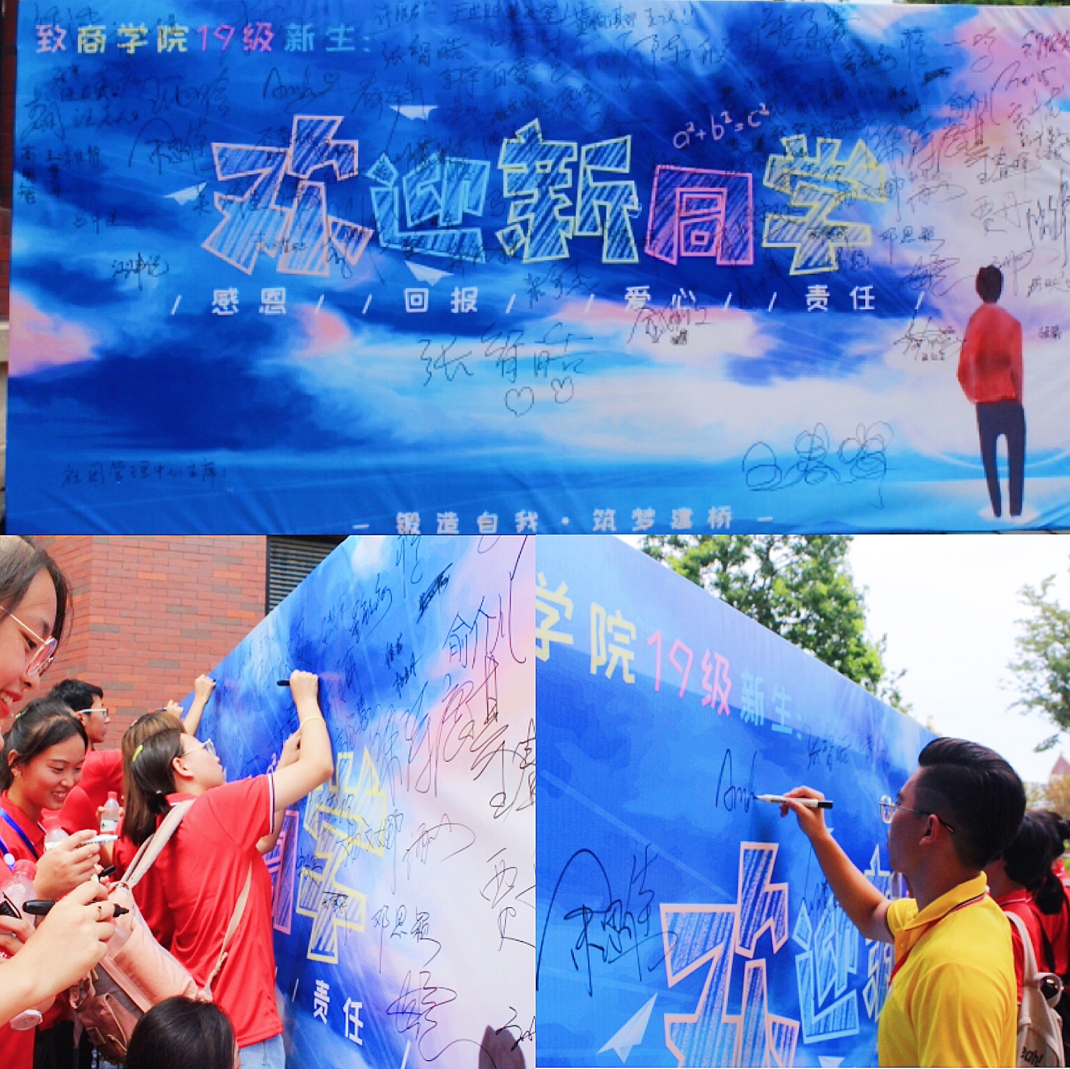 商学院提前准备了“欢迎新同学”的签名墙,迎新当天许多新生在此拍照留念。新生在此留言拍照,写下对未来的希望,留下自己的姓名。每一张签名和照片都代表着新生对校园的期盼与憧憬。