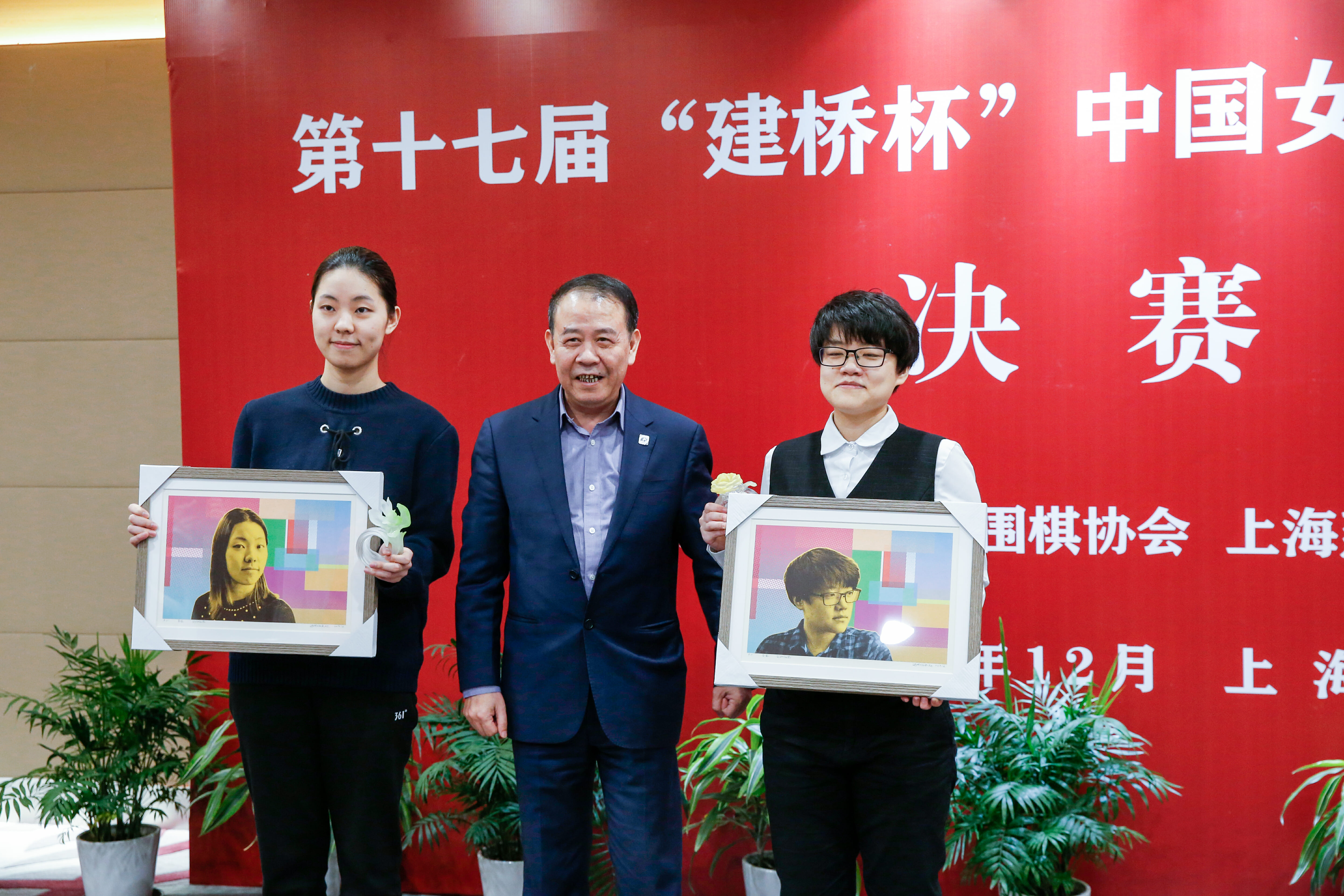 采访结束后,上海建桥集团董事长周星增为王爽和潘阳颁发了两位棋手的版画。