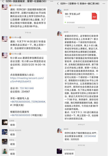 “因为怕网络崩溃,为防万一,除了BB平台,我还采用了学习通软件以备用”,商务英语专业主任臧玉洁老师在学院群里向老师们分享她的做法。老师们纷纷为她这个周全的做法给她点赞。机电系李传敬老师通过百度网盘将相关课程PPT、教学视频、动画等素材传送给学生,进入正式课堂学习前预习,深受学生欢迎。应用外语系商务英语专业的任课教师胡素平还采用二维码简易的方法,一步步耐心指导学生下载学习通教学软件。航空服务系的杜丽娟、徐仁芳等老师在开课之前利用腾讯会议平台召集全体学生会议。