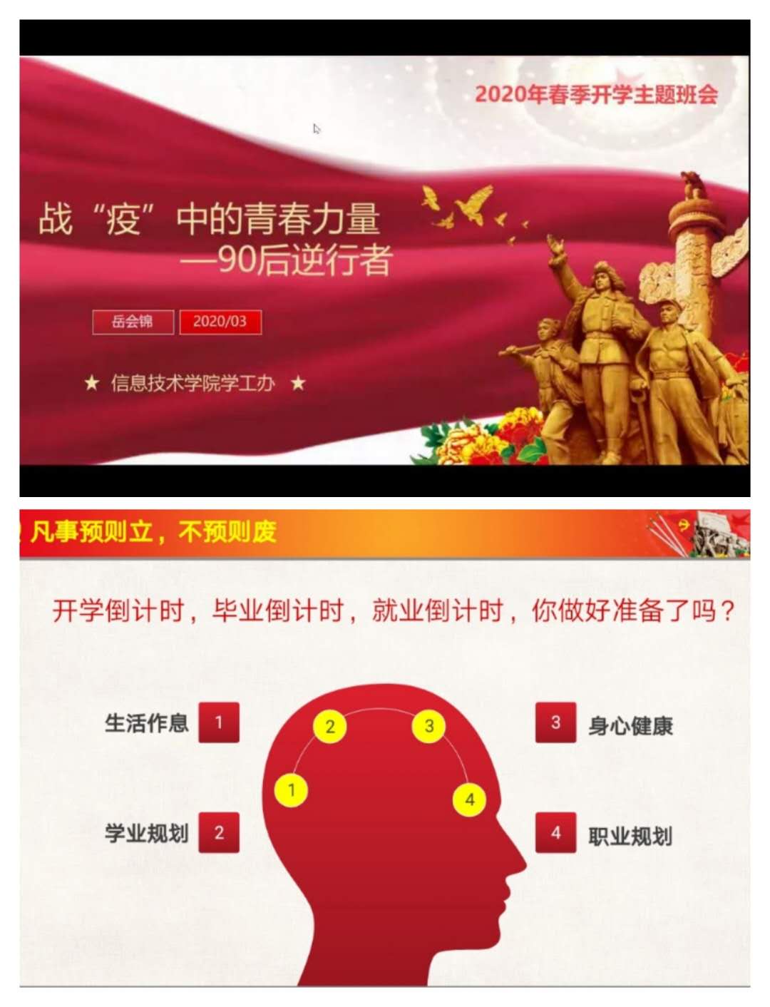 为保障线上教学秩序的顺利进行,学工口的辅导员们更是不敢有丝毫懈怠。除了及时把相关通知告知学生,督促学生填报每日健康反馈,组织学生进行在线学习,协助任课教师做好班级微信群的建立及在线课程的授课工作外,每位辅导员还精心策划并开展了特色的“主题云班会”,为的是在疫情防控最吃劲的阶段里坚定同学们战胜疫情的信心,激励同学们做有理想、有本领、有担当的新时代大学生,在线上教学开展之际,引导同学们树立学习目标、保持良好的心态进入学习状态。
