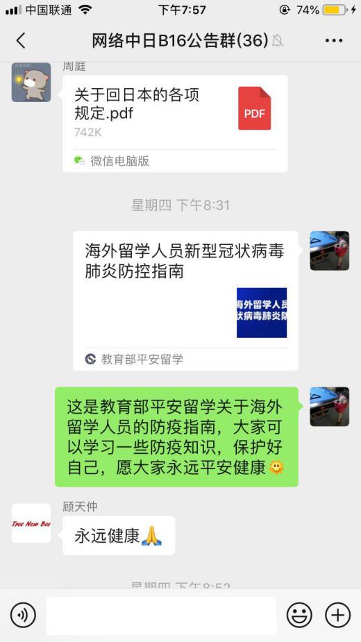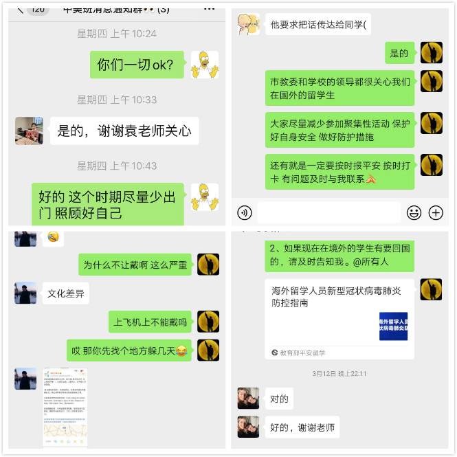 学子们纷纷表示自己在海外一切安好,也一直在国内外疫情动态,心系祖国。目前每一位学子均做好了防护措施,也尽力减少出门次数。对于学校和学院的问候和关心,学子们充满感激。师生共同期待抗击疫情取得全面胜利后的相聚。