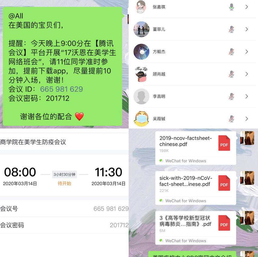 商学院远程连线的方式与正在美国沃恩航空科技大学留学的58名同学以及在日本京都情报大学院大学留学的8名学生分批召开了疫情期间师生联络会,加强对海外学生疫情防控教育和管理。在会议上,学院领导向身处海外的学生们表达了问候,并向学生们宣讲了海外留学人员新型冠状病毒肺炎防控指南,关照同学们务必要把安全放在首位,要做好个人防护,审慎出行,减少不必要的外出、聚会等活动,避免前往人群集中的场所,以降低感染风险。同时安抚学生要理性面对疫情,科学进行防控,及时调整心理和情绪,加强相互关心和友爱,不信谣、不传谣,不恐慌。如遇困难,要及时告知学校,学校将竭尽所能为大家提供帮助。同学们就目前的学习的生活情况与领导和老师们进行了沟通和交流。