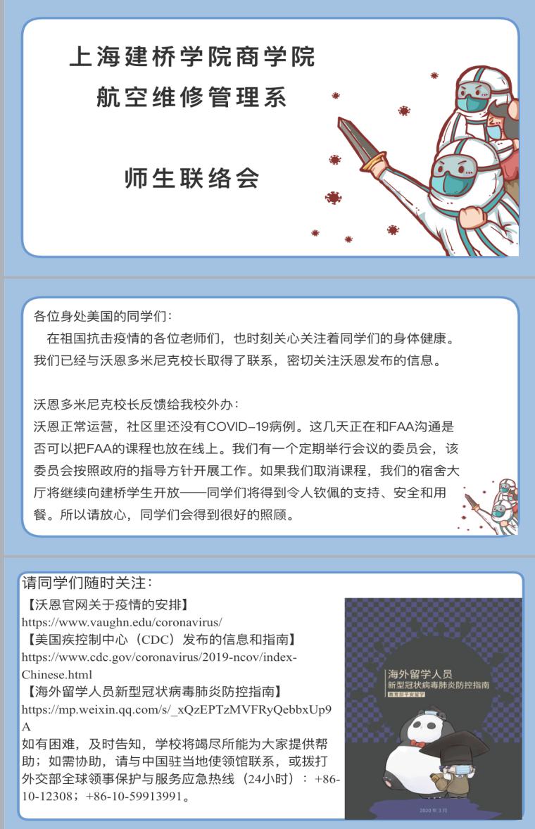 同舟共济战疫情,春暖花开终有时。虽然远隔重洋,却从未远离。面对严峻的疫情防控形势,建桥全体教师将持续关注关心海外交流学生,做好疫情防控工作,希望同学们在海外平安顺利。
