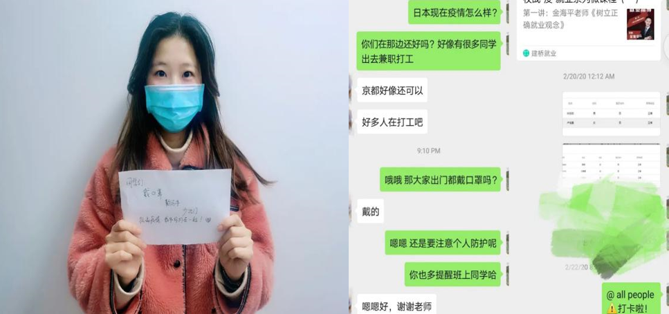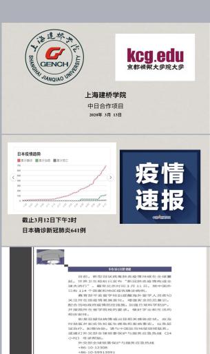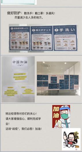 海外学子是学校最大的牵挂,中日合作项目负责人刘潇滢老师时刻与京都情报大学院大学保持沟通,向学生传达在日疫情防控指南,定期开展师生联络会,密切关注在日学子的健康和生活情况。同时,刘潇滢老师提醒同学们提高自我防护意识,主动定期地向双方学校报告健康状况以及学业情况,以便学校能够及时予以协助与支援。当前全球疫情还在蔓延,疫情防控正处在关键阶段,希望海外学子们保持理性和科学的态度,把握与配合在日本的抗疫指引与措施,保护好自己,和祖国人民一起,和日本一起,同舟共济、共克时艰。