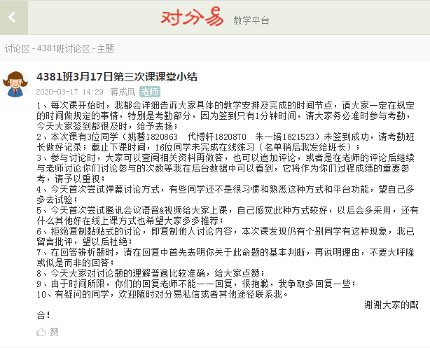 微信通知“教学安排”。她一般会在课前十分钟,以对分易消息的形式把本次课精确到每分钟的具体教学安排通知到每一位学生,使学生明确自己在90分钟的教学时间里的学习要求和任务,避免学生在在线课堂上不知所措、手忙脚乱,使得他们能在相应的时间节点完成相应的任务。
