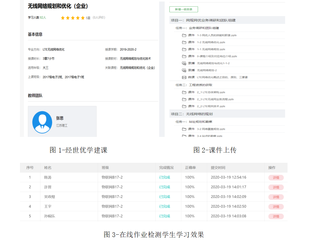 疫情防控期间,经世优学平台面向全国高校免费开放,共享教学资源。依托经世优学在线教学平台的存储、在线作业等功能,驻校团队各位讲师根据各自课程特点,建立了线上课程资源,将授课课件及教学资料实现在线上传、学生同步查看。除查看课程课件之外,学生还可以免费观看资源库中的微视频,方便学生通过互联网资源进行自我充电,了解自身长短板,实现个性化学习。为检查学生的学习效果,讲师们建立了作业库,实现课前预习作业与课后检测两不误。为了解决学生没有课程教材的问题,讲师们积极将教材的电子版上传到经世优学平台与班级群中,方便学生提前预习和在线学习时使用。此外,经世优学平台还具备数据统计功能,可以显示学生的学习进度、在线学习时长、作业完成情况等信息,为讲师了解学生学习动态提供了有益的途径。