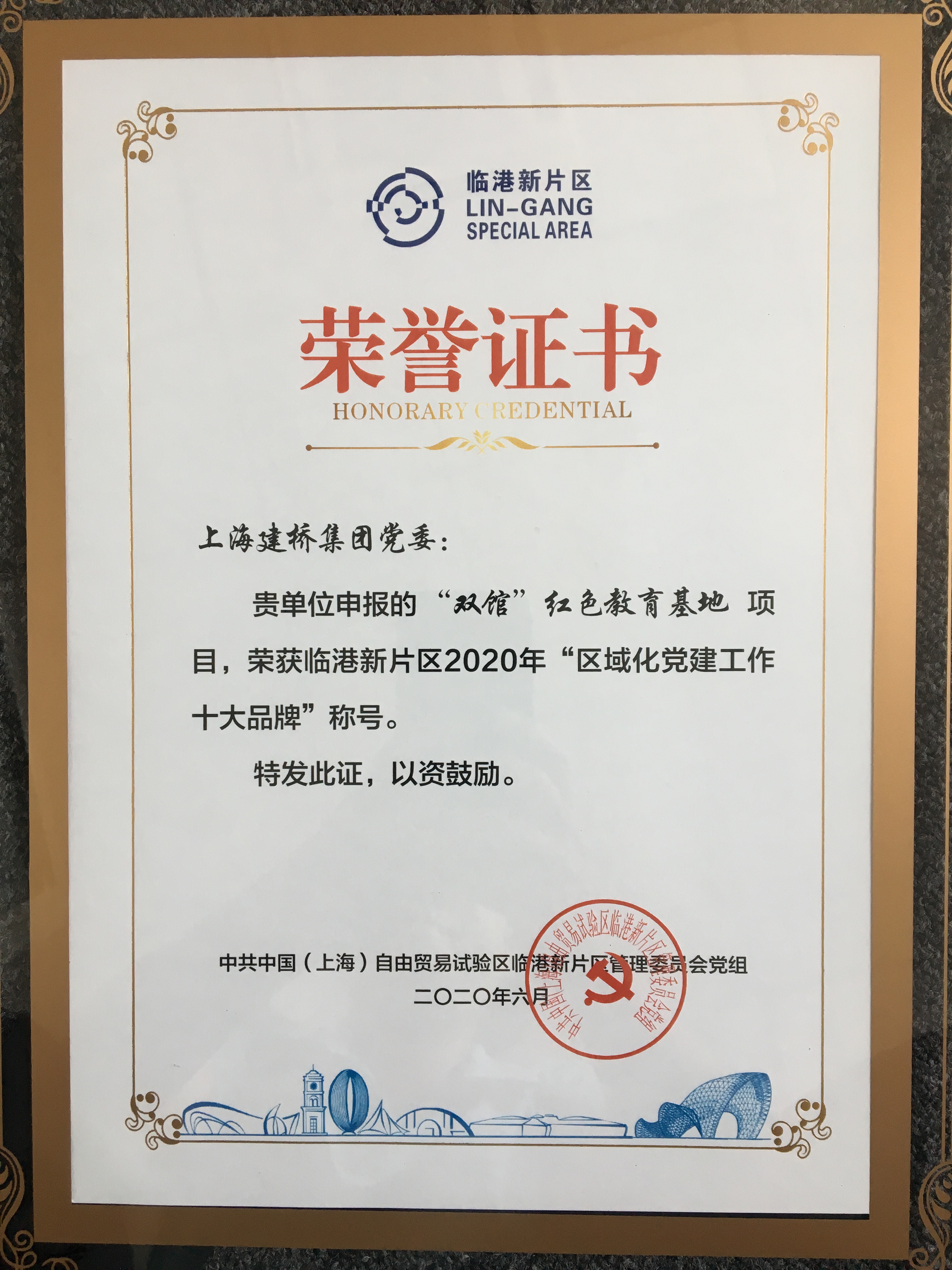 建桥学院倾力打造的“双馆”红色教育基地——国政馆、雷锋馆,荣获临港新片区2020年“区域化党建工作十大品牌”称号。集团党委书记、副校长俞晓光代表学校领取了荣誉奖牌。