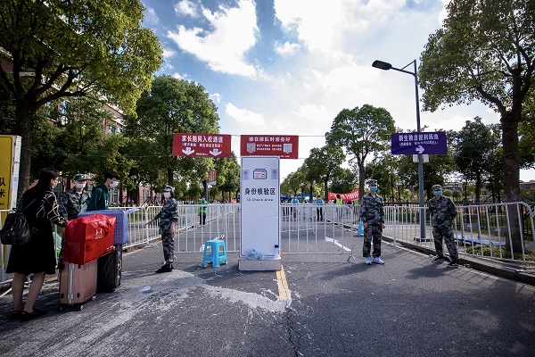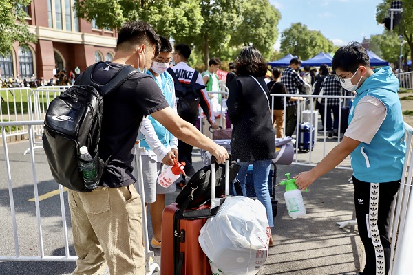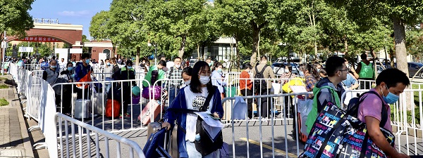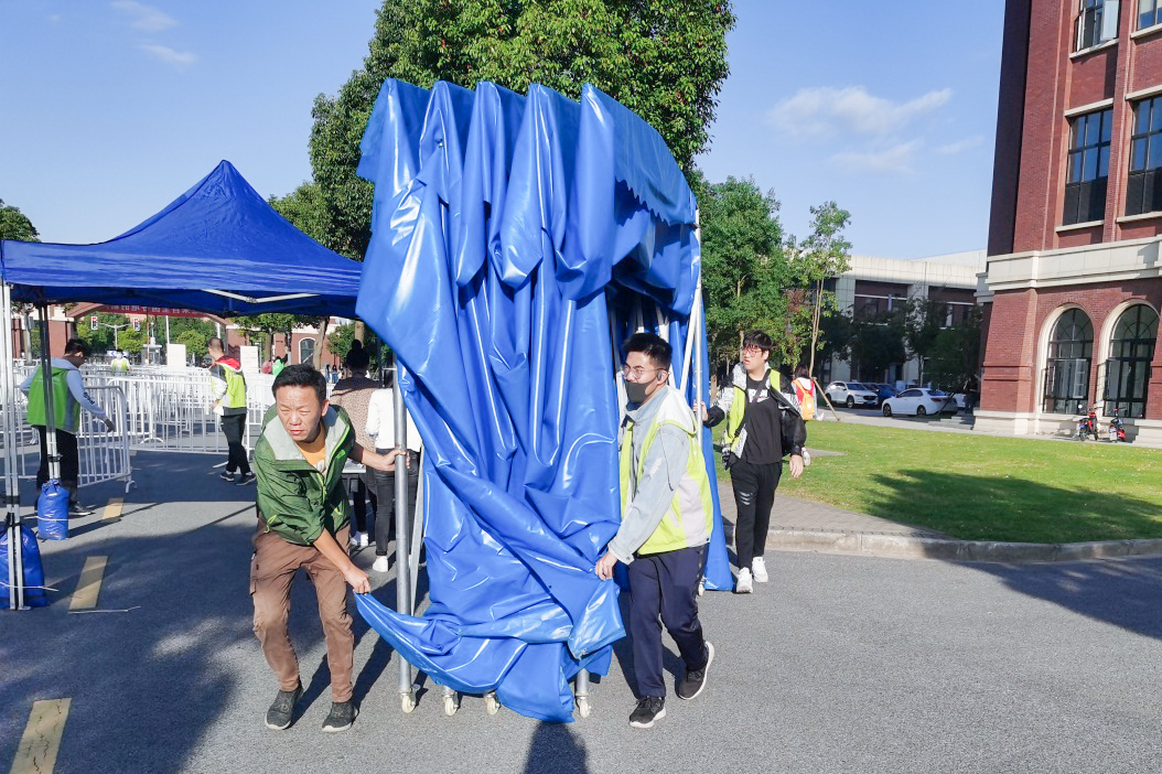 作为校园疫情防控第一道防线的“守门人”,安保服务中心所有人员除开展迎新前校园重点场所的安全检查外,还积极配合后勤做好各项迎新保障工作,在学校各园区及校门区域共搭建各类帐篷60余顶、200余个铁马栅栏。分别设立测温组、车辆疏导组、校园巡查组,分工到岗、责任到人。同时,提前对接临港交警、高校派出所协助交通管理和校园秩序维护工作,确保了迎新期间校园周边交通顺畅、报到有序。