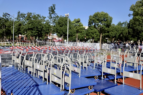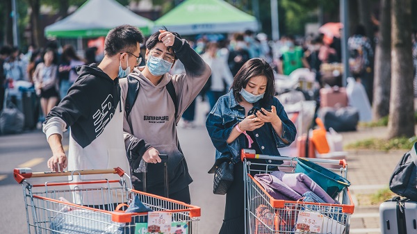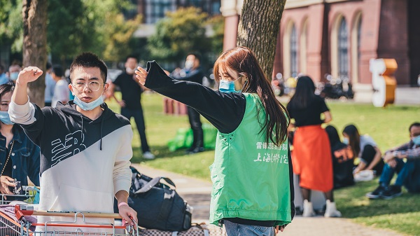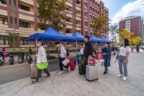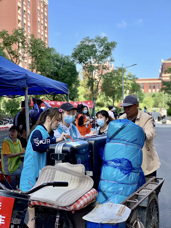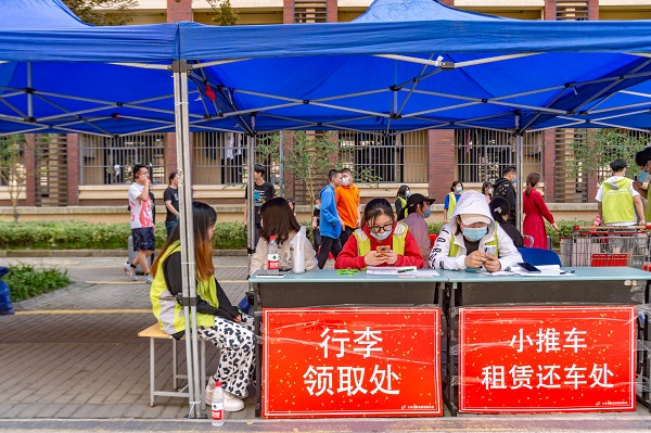 在地铁站,接驳车从早8点到晚8点不间断发车,迎接新生;学校还提供小推车租赁服务,在四个园区提供近百辆小推车及140辆购物车、20辆免费短驳车,为新生搬运行李提供便捷。