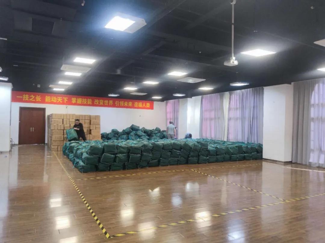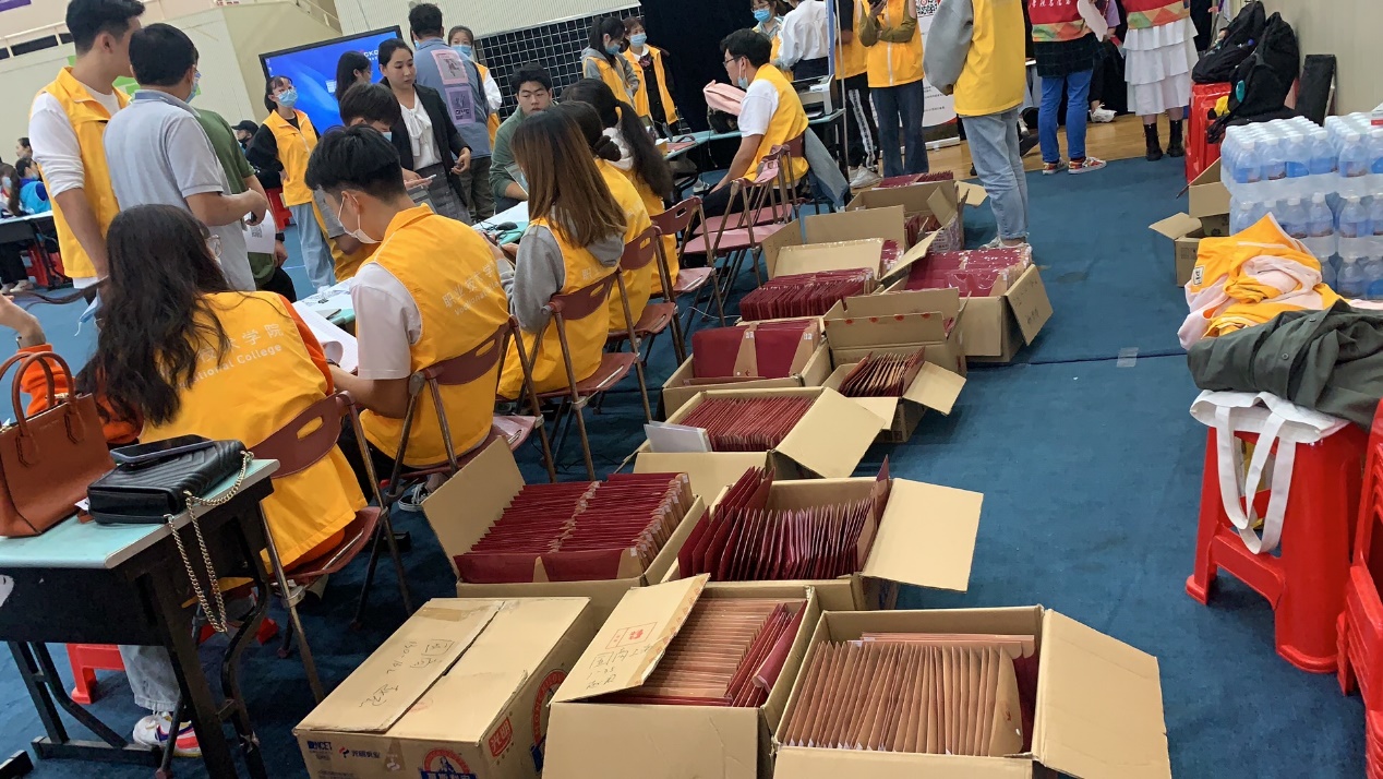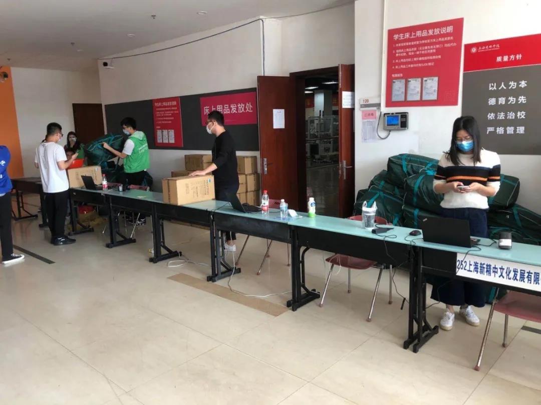 迎新当日,清晨六点多,相关职能处室教职员工、后勤人员、志愿者已准时到岗,全部就位,为来校新生提供校园攻略引导,发放寝室用品,搬运行李等各方面服务。寝室用品方面,为保障学生用到优质舒适的床上用品,资产处从暑期即安排专人进行准备,比选合格供应商、做好预订登记、安排成品抽样送检并取得合格检验报告等,并积极配合学生处、后保处、信息办等部门参与迎新系统床品发放模块调试,做好发放预案,确保千余套床上用品发放工作准确、有序、高效。同时,新生教材发放工作亦如火如荼地进行中,本学期新生教材预计需发放约450种,合计约10万册。