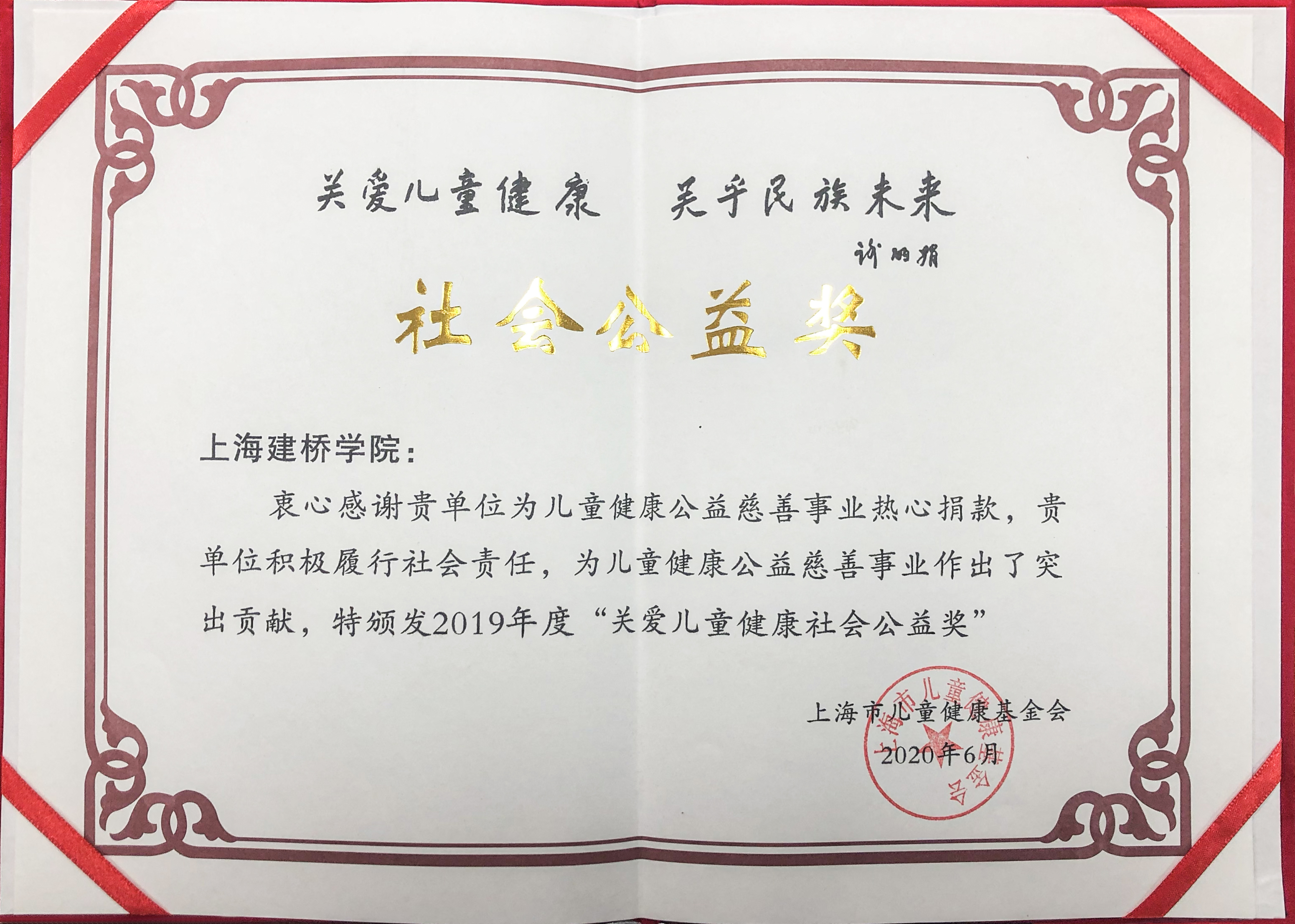 近日,上海市儿童健康基金会向我校颁发2019年度“关爱儿童健康社会公益奖”,感谢我校积极履行社会责任,为儿童健康公益慈善事业热心捐款,为儿童健康公益慈善事业作出突出贡献。