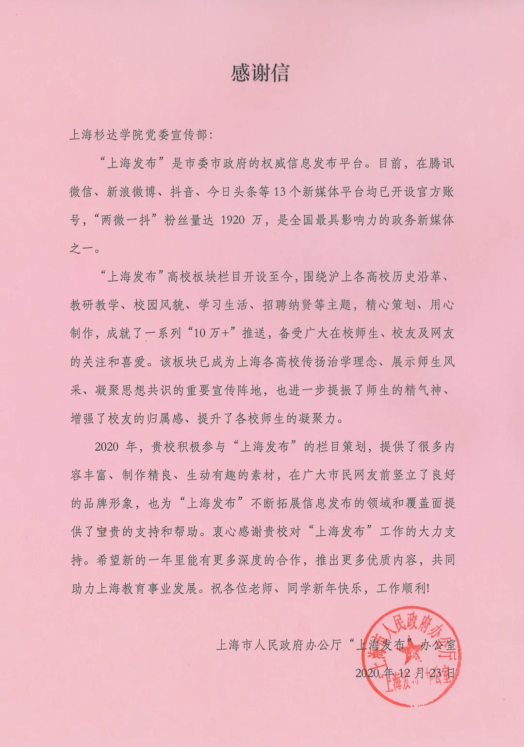 日前,学校收到一封来自上海市人民政府办公厅“上海发布”办公室的感谢信,感谢我校一直以来对“上海发布”新媒体平台的支持。