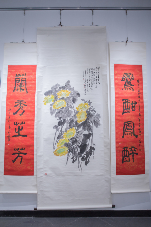 展厅展出的董芷林的画作,果蔬葱郁俊美,松竹雄逸纵肆,花卉鲜艳生动,山水浑融隽永;他的书法作品有法度而不囿于矩矱,痛快而不流于狂悖,且尤精篆书。他坚持文情并茂的文言诗文创作,严格韵律,妙于文辞,所作书画大多自撰诗文钤以自刊之印,趣韵互融,相得益彰。他的印面章法如画法,出刀同运笔,儒雅典正,自饶风味,与书画作品相映成趣。