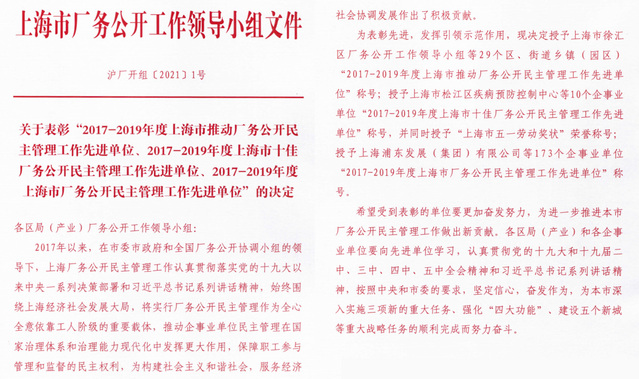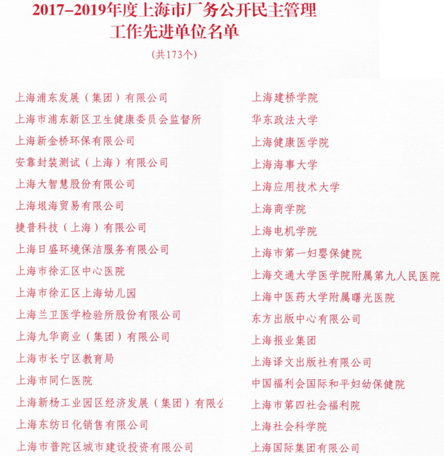 2017-2019年度上海市厂务公开民主管理工作先进单位