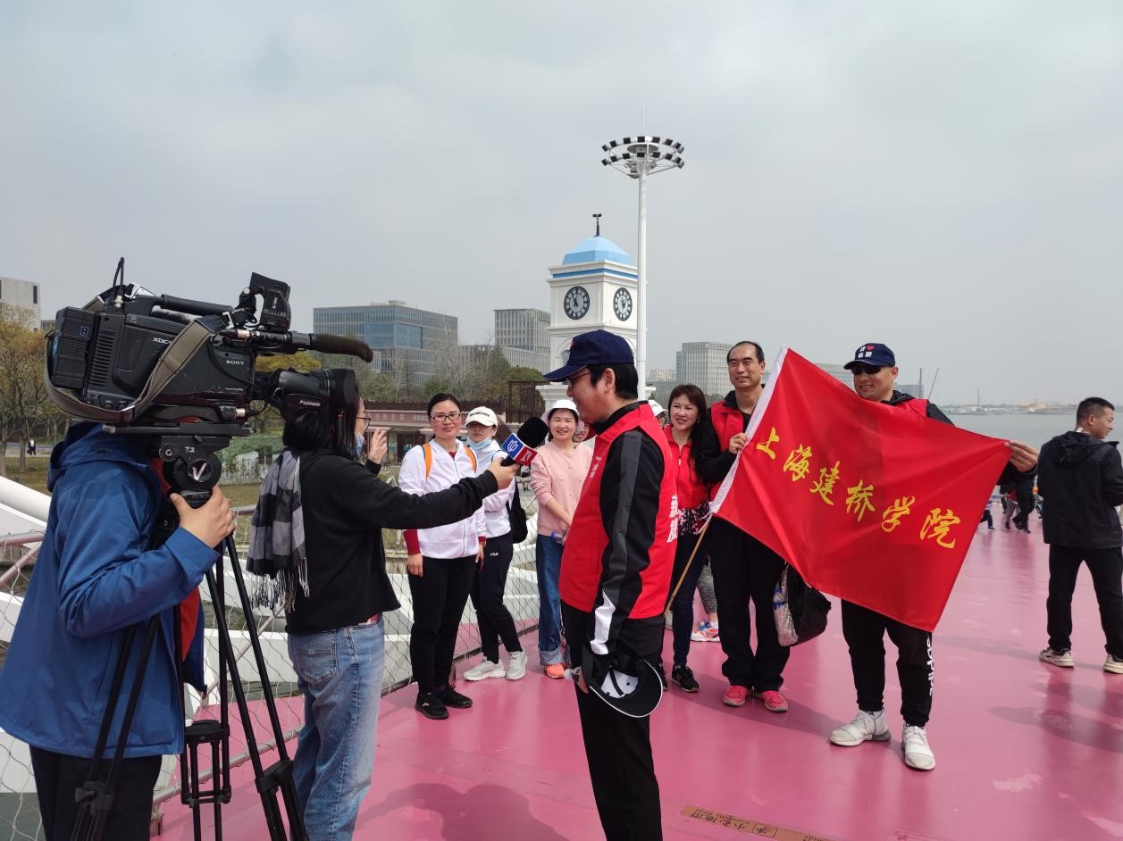 途中我校校长朱瑞庭接受东方卫视的采访时说道:“滴水湖共有7座桥,每一座桥连接的是一段故事,一段关于美丽临港的故事,每天生活在临港的我们想一起走完这七座桥,一起感受临港的魅力”。