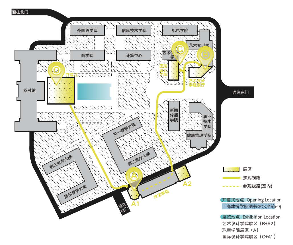 2.联展时间及地点:2021年6月3日—6月17日,艺术设计学院展区(B+A2)、珠宝学院(A)和国际设计学院(C+A1)。