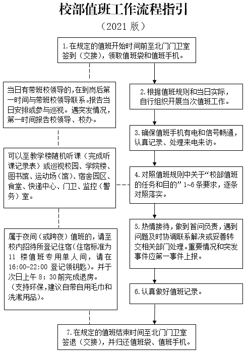 5.按照值班工作流程,完成值班期间的各项规定动作,属于夜间值班的,应当按要求在校内住宿,不擅自离开校园,按要求准时做好现场交接班。