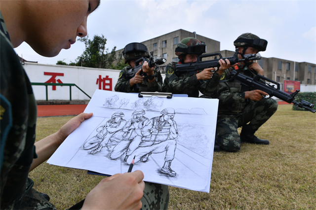每到自由活动时间,赵得琛便扎进画室,对着照片进行创作。在安静的画室中,赵得琛在书桌前铺开画纸,对着自己相机里战友们英姿勃勃的照片一笔笔描绘下来,脑海中不时闪过入伍期间和战友们并肩训练的场景。