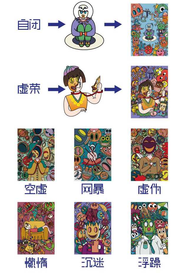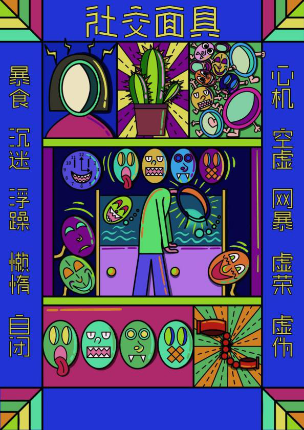 创作说明:身处社会的我们在生活中会使用各种不同的社交软件 , 而我们在使用这些软件时,往往不会将自己真实的一面表现出来。而是为自己戴上不同的社交面具,从而掩饰真正的自己。社交面具的平面插画目的是唤醒年轻人消极生活状态而做出的作品,希望能够让年轻人意识到现在大多数人的生活状态。插画选用积极丰富的撞色来凸显画面,从而增加画面的视觉冲击感。同时用较为可的形象来吸引年轻人的目光。让他们摆脱消极的面貌,积极地面对人生,尽情地享受生活。用生活中的场景作为插画素材,从而体现真实感,并唤起共鸣。从而积极地面对生活,真正地成为“后浪”推动自己的进步以及社会的发展。