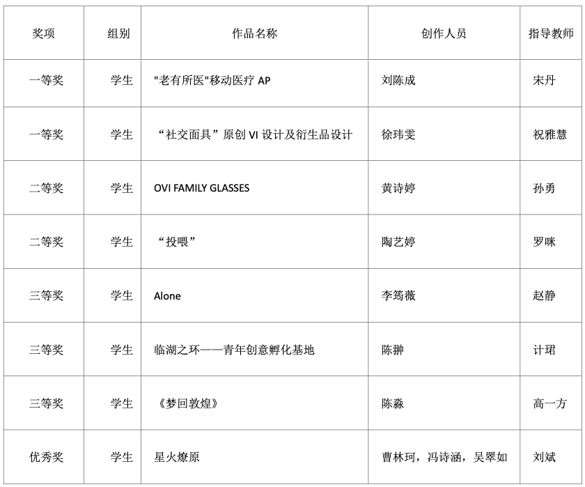 本届大赛设有28个赛区,1456所高校参赛,共征集119,785幅作品,参赛作品经校赛、预赛、初赛、复赛、全国总决赛五轮选拔。我校学生作品在上海赛区所获总奖项共80项,其中一等奖11项、二等奖26项、三等奖43项,在上海市各高校中名列前茅。在全国总决赛中,刘陈成同学作品《“老有所医”移动医疗APP》、徐玮雯同学作品《“社交面具”原创VI及衍生品设计》分别斩获两项一等奖,其余作品获二等奖2项、三等奖3项、优秀奖1项。