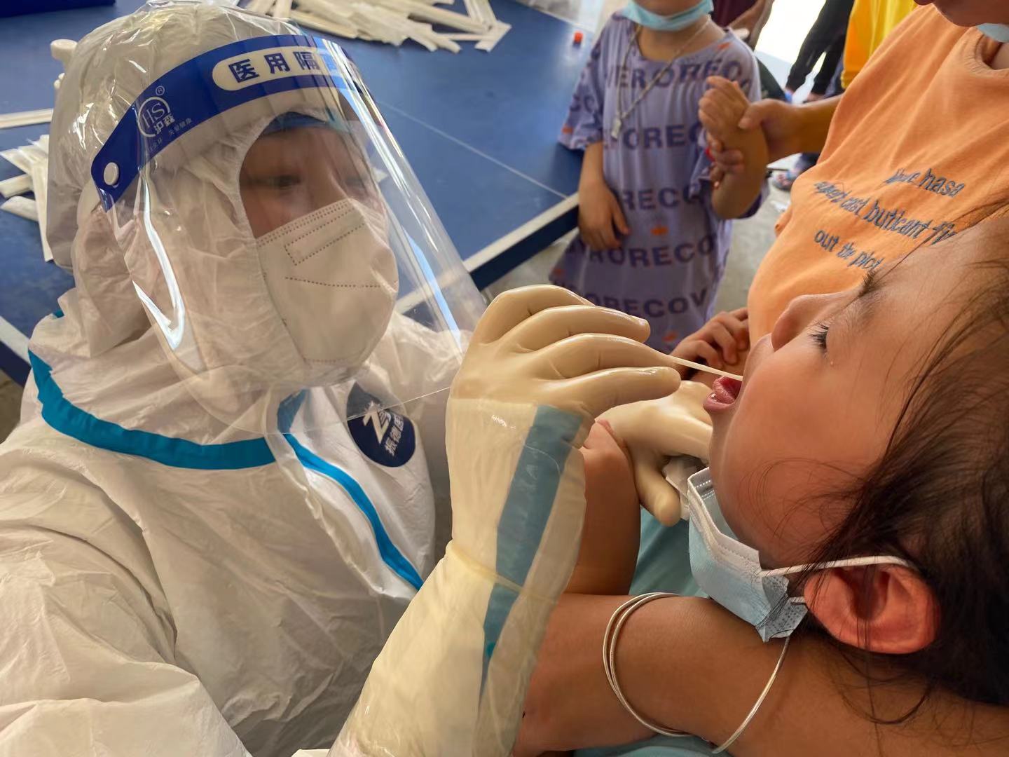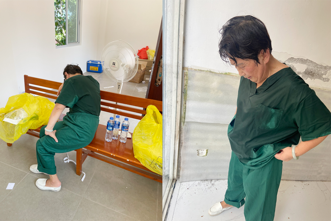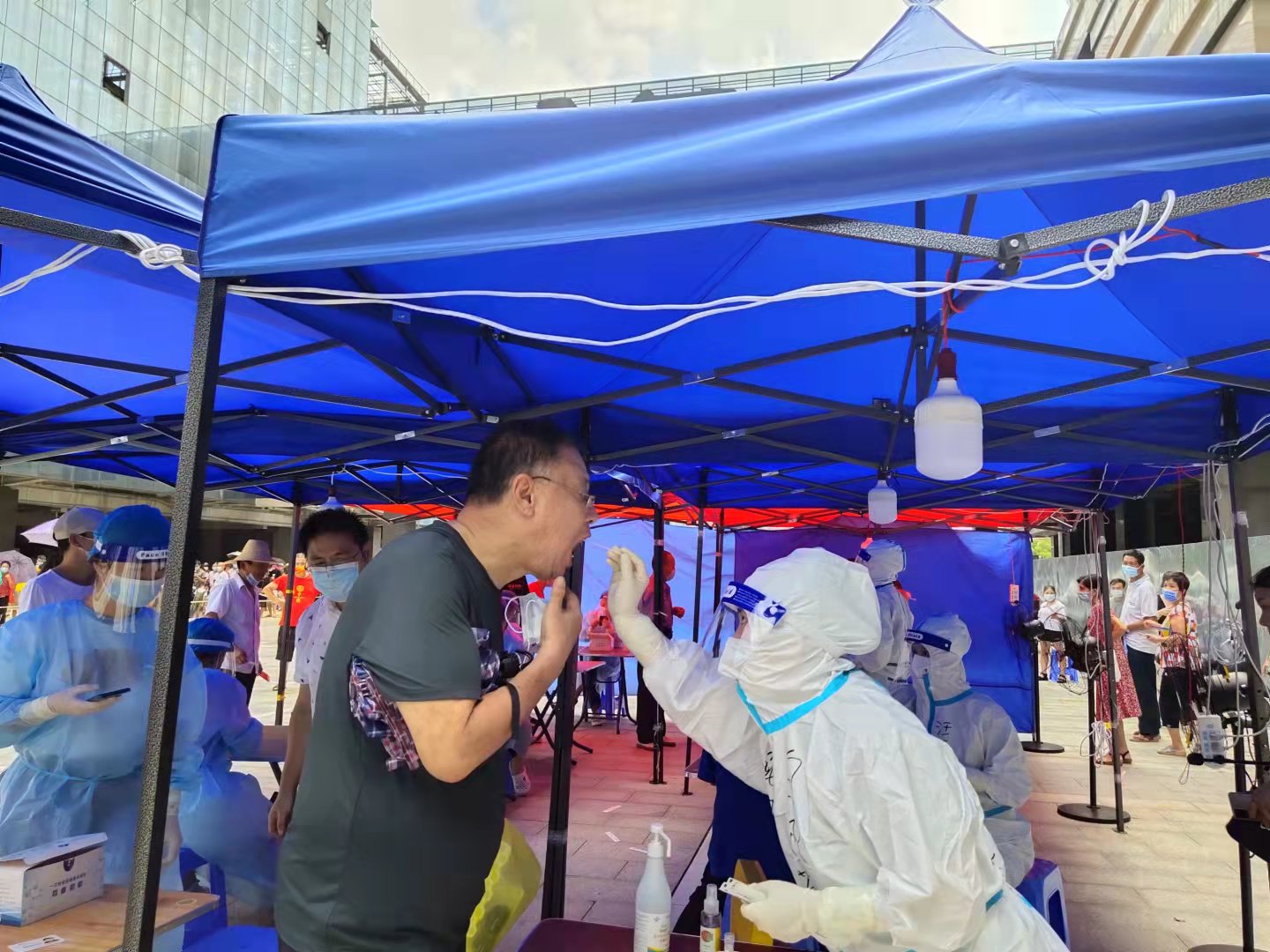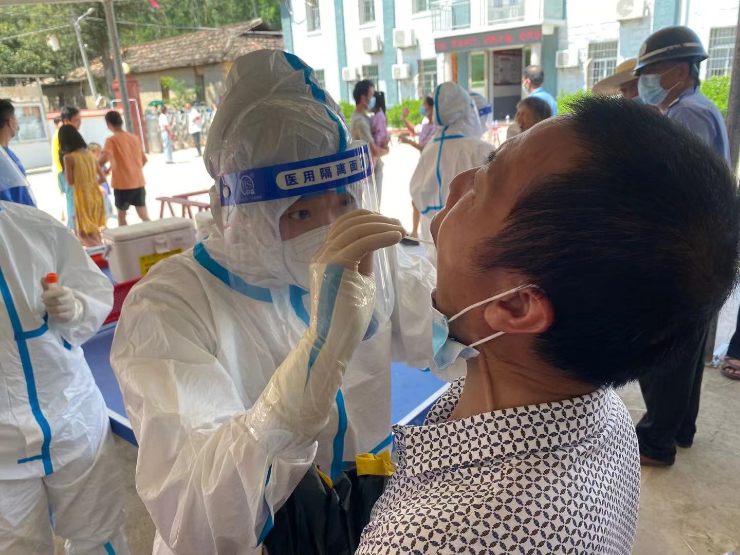 夏日莆田炙热的天气,大棚下排队前来检测的村民汗流浃背,而穿着厚重防护服的医疗队员所面对的更是难以想象的潮湿焖热。张雅丽在工作中以身作则、身先士卒,毕竟是65岁的老人往往两个小时下来,全身汗水不停往下流,头发像刚洗过一样,衣裤早已湿透。起初3天更是2次晕倒,在就地躺下紧急灌入口中盐水2000毫升后,症状才稍有好转,她便继续投入咽拭子核酸采样工作中。
