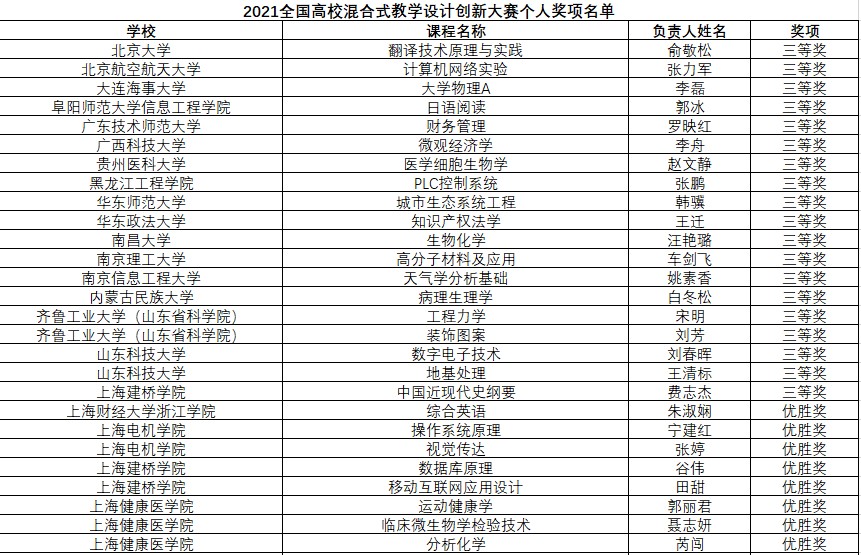 2021全国高校混合式教学设计创新大赛复赛结果于11月11日进行公示,我校马克思主义学院费志杰老师的《中国近现代史纲要》课程荣获三等奖,职业技术学院谷伟院长的《数据库原理》和艺术设计学院田甜老师的《移动互联网应用设计》课程荣获优胜奖。