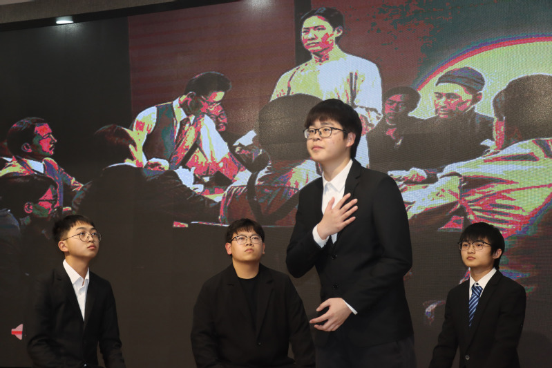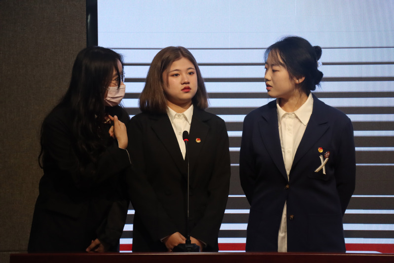决赛共设置了击鼓传花(人物图片题)、妙语连珠(事件图片题)、言之有物(情景剧表演)三个环节。在第一环节辨别世界知名人物的比拼中,各位选手准备充分、胸有成竹、信手拈来,邱少云、雷锋、焦裕禄、孔繁森、朱德、马龙、普京......选手们脱口而出一个个鲜活的名字,11个学院中有9个学院都获得了满分。在比分胶着、相持不下的紧张状态下,选手们迎来了比赛的第二环节,健康管理学院的邵洁同学结合自己的学习体会对《十九届六中全会》这一事件图片题进行了概括和阐述,讲解非常到位,赢得了现场老师与同学的频频掌声。商学院的李睿健同学则抽到了《2021年“中美高层战略对话”》这一事件图片题,他侃侃而谈,既概括了此次对话的主要内容,还表达了自己的看法,他指出“历史已经过去,中国已经崛起”“感谢祖国的强大”“大国崛起,吾辈当自强”,其亮眼的表现给评委老师们留下了深刻的印象。新闻传播学院的霍彦坤同学对《神舟十三成功发射》的评述也非常精彩,她既解读了神舟十三号飞船成功发射的重大意义,也对飞船搭载的三名宇航员的故事如数家珍,显示了扎实的理论功底。在“言之有物”情景剧表演环节,参赛学生的表演精彩纷呈。商学院学子带来的《中国外交风云》以宏大的历史视野,真实地再现了新中国成立以来中国外交进程和在中国大地上发生的翻天覆地的巨变。信息技术学院的《忆往昔峥嵘 铸百年辉煌》则带领我们重新回顾了中国共产党从嘉兴南湖红船到今天的百年沧桑巨变,跟随着剧中一幕幕历史片段,不由让人心中汹涌澎湃、热血沸腾,感慨共产党历经风雨后的历久弥坚。外国语学院的情景剧《醒悟》的设计与编排非常巧妙,他们以“穿越”为视角,再现了共产党百年奋斗的坎坷沧桑与波澜壮阔。机电学院的《刘胡兰——生的伟大 死的光荣》、艺术设计学院的《最美逆行者》、珠宝学院的《五四风云第一幕》、职业技术学院的《金色的鱼钩》、教育学院的《庆祝建党百年 展建桥学前风采》......选手们精心编排的情景剧把比赛推向了一个又一个新的高潮,表演者气势如虹、铿锵有力,使得比赛精彩纷呈、高潮迭起、掌声雷动。