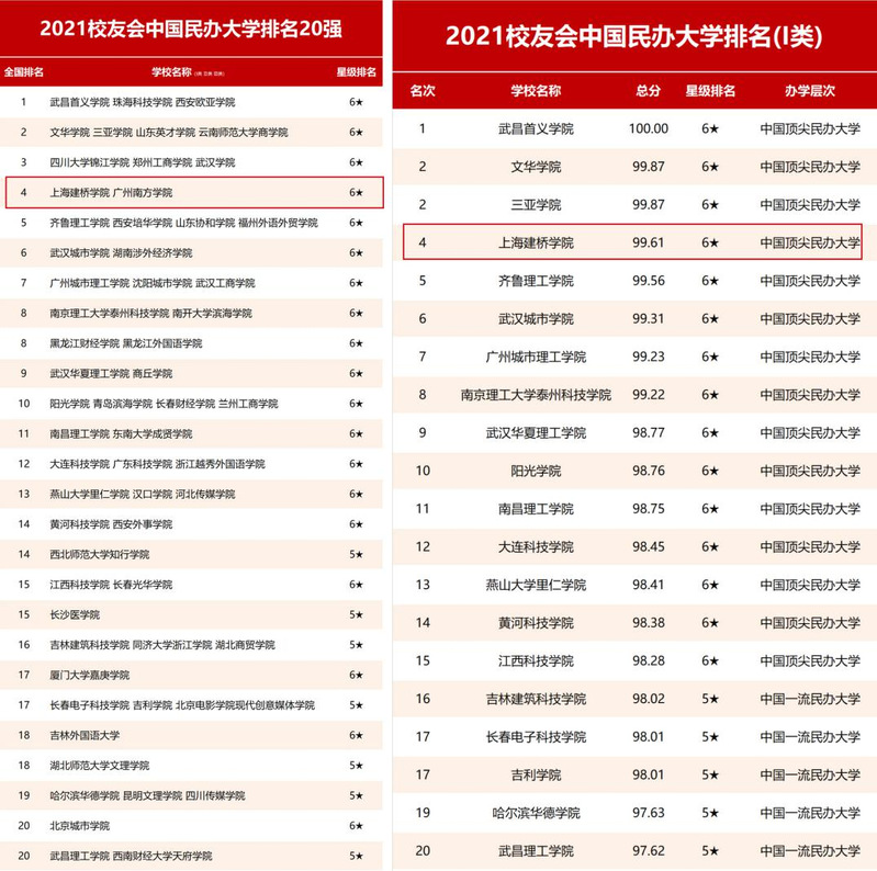 在2021年上海高校分类评价结果中,我校在17所应用技术型高校中连续四年位列上海民办本科第一。我校充分发挥分类评价在学校内涵建设和特色发展中的目标引领作用,科学分析评价指标内涵,将“对标分类评价指标”作为年度卓越建桥计划制定的指导思想,将分类评价指标融入到每年度的“卓越建桥计划”的绩效目标;将“对标新时代教育评价改革总体方案、新一轮本科教育教学审核评估方案、上海高校分类评价指标”写入“十四五”规划。三年来,坚持从多个维度对分类评价数据进行再分析、再挖掘、再利用,编制学校二次分析报告,基本构建了学校的“评价指标数据池”,努力实现以数据驱动学校的内涵建设和质量提升。3月25日,全国第三方大学评价机构艾瑞深校友会网发布《2021校友会中国大学排名—高考志愿填报指南》。报告显示,上海建桥学院位列2021校友会中国民办大学排行榜第四,排名稳步提升。