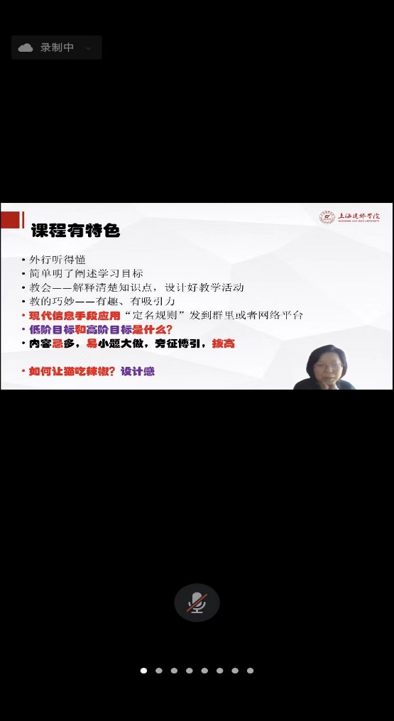 4月3日,启动青教赛在线磨课培训,邀请陈苏婷、吴晓两位老师进行参赛节段展演,邀请荆筱槐副处长、陈志澜院长、谷伟院长、尹卫华副院长指导点评,同时分享对于如何准备青教赛的建议。陈苏婷老师曾参加过2018年第三届上海高校青年教师教学竞赛,并获得了自然科学基础学科组别二等奖。陈苏婷表示,通过比赛她深化了对“以学生发展为中心”教学理念的认识,她认为参加青教赛对于选手来说是迈入教学能力提升的快车道。吴晓表示,青年教师一定要多想多试,多争取机会参加各类比赛,在比赛中好好打磨自己的课程、提高自己的教学能力。陈志澜院长、谷伟院长、尹卫华副院长对两位老师的展演提出有针对性的指导建议,指出教学设计要凸显教学思路,教学内容需要重新进行合理编排,教学案例要具有趣味性、应用性、前沿性,教学节段选择的知识点要少而精。最后,荆筱槐副处长指出,青教赛对于教师个人职业成长、高等教育现代化发展都具有重要意义,希望大家居家办公期间也不要放松备赛,以最充分的准备和最饱满的状态迎接即将到来的比赛。