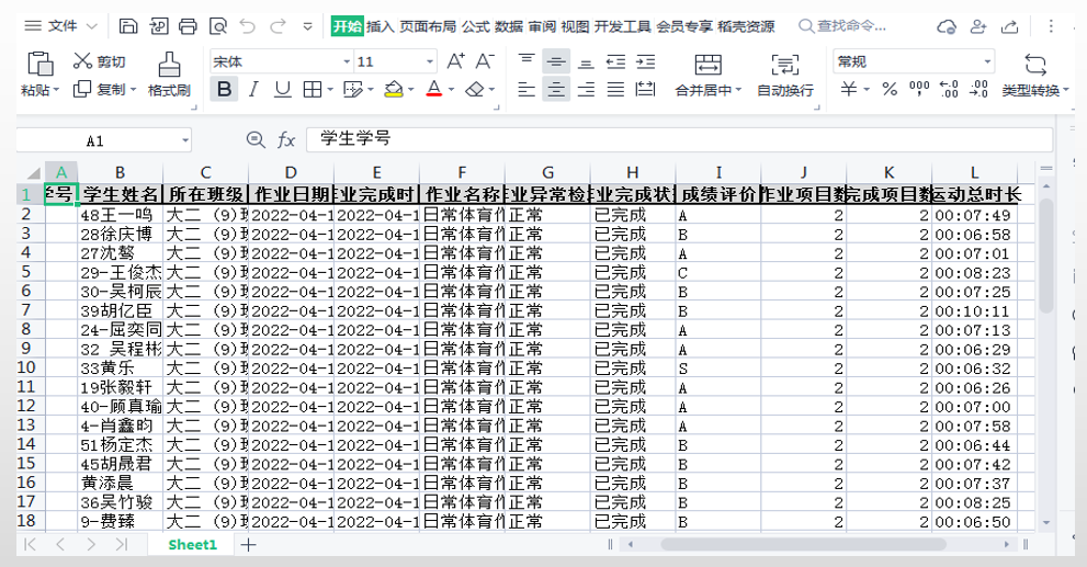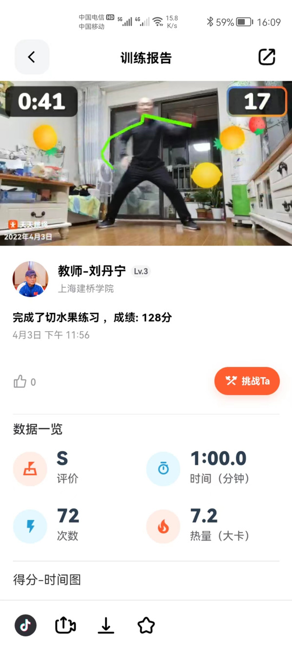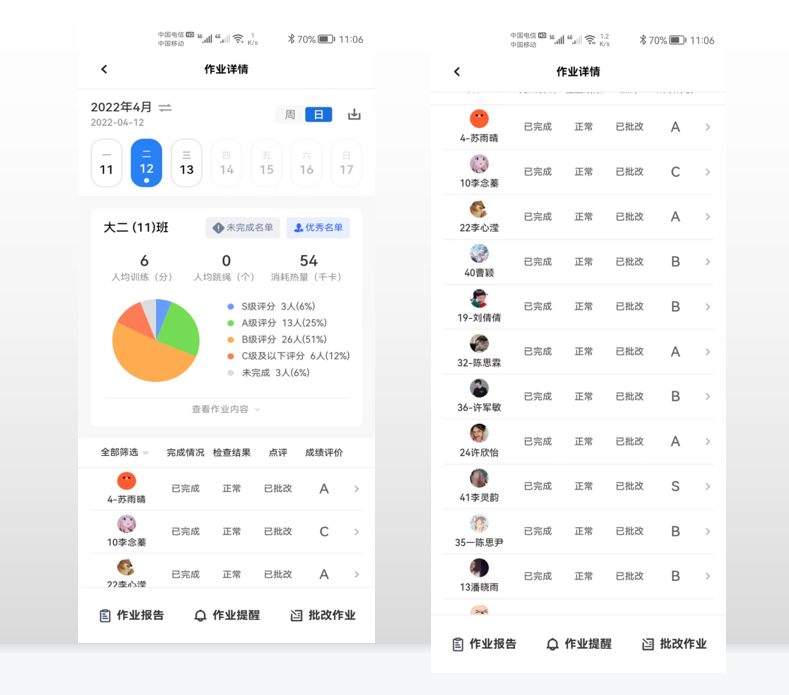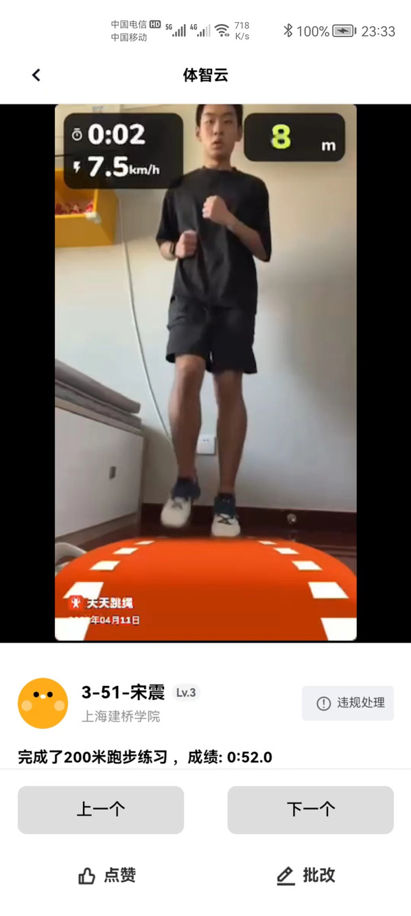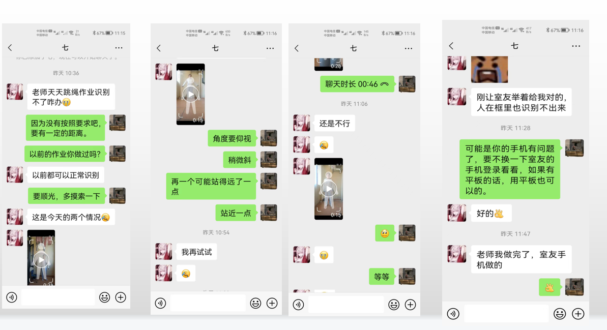 刘丹宁老师既是“教练员”,又是“裁判员”,还是“啦啦队员”,他精心设置运动内容,激励同学们参加锻炼。课程中他利用软件实时监测学生练习情况,对于同学们上传的运动视频作业给予及时指导,认真仔细批改作业、做好统计并及时反馈点评,以提高学生居家锻炼的积极性和质量。