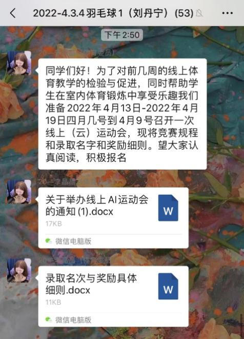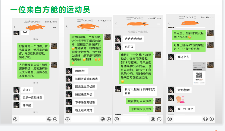 对于一些特殊同学,刘丹宁老师“隔空”投送人文关怀和开展心理疏导。有一位同学入舱后,刘丹宁老师几乎每天通过微信和他联系,鼓励他放松心态,适当运动,增强抵抗力,积极应对疫情。在他的鼓励和引导下,这位同学也积极报名参加了线上运动会。