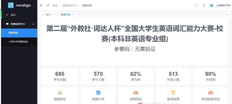4月15日下午,第二届“外教社•词达人杯”全国大学生英语词汇能力大赛上海建桥学院校赛顺利举行。本次比赛由外国语学院主办,分为本科英语专业组、本科非英语专业组、高职高专组三个组别,共吸引了来自全校的753名学生参加,经过一个小时的激烈角逐,本科英语专业组王佳英等6位同学,本科非英语专业组郭禧诗等29位同学以及高职高专组韩雪等4位同学成功晋级上海市省赛。上海市省赛将于5月21日晚8点举行。