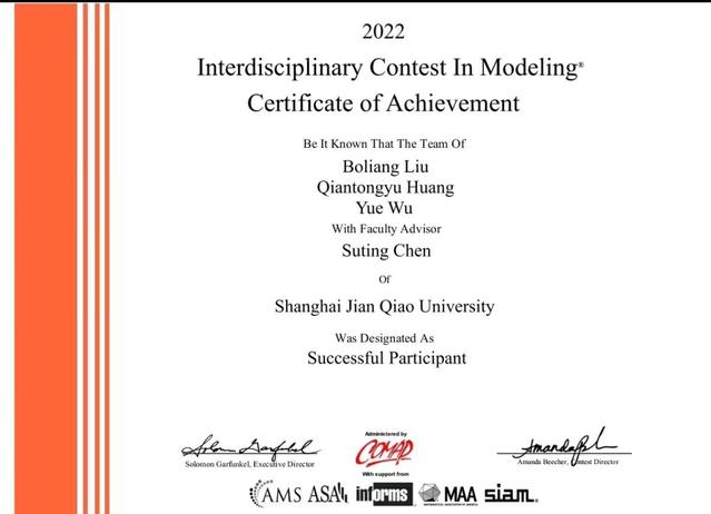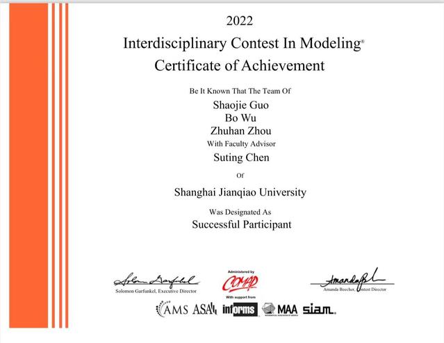 近日,2022年第38届美国大学生数学建模竞赛(MCM/ICM)结果公布。由我校数学教研室组织和培训的四支参赛队伍参加了美赛The Interdisciplinary Contest in Modeling (简称ICM)项目的角逐。在比赛规定的四天时间内,学生们用全英文的论文形式,就指定的交叉学科问题,完成从建立模型、求解、验证到论文撰写的全部工作,最终获得三个国际S奖。