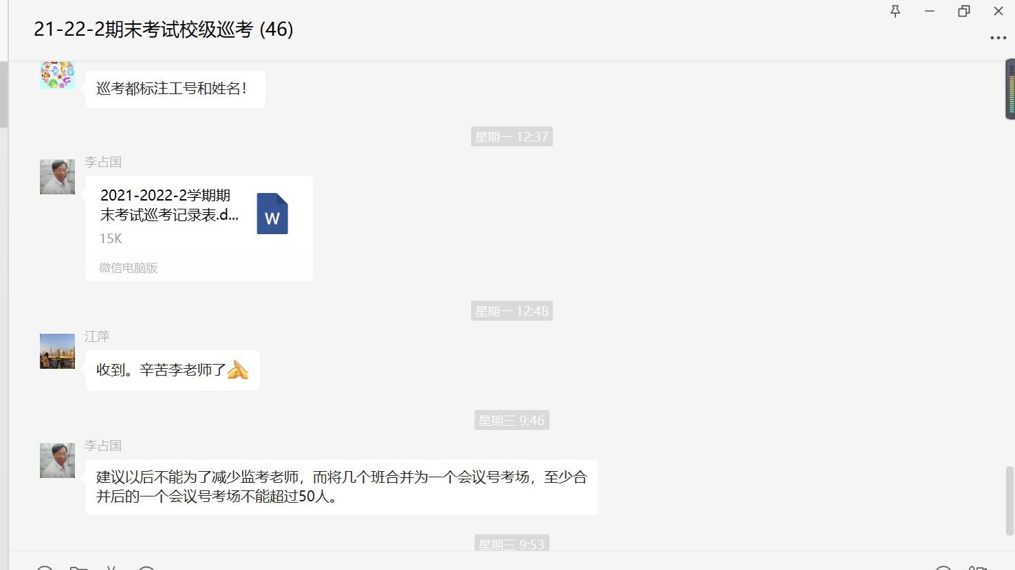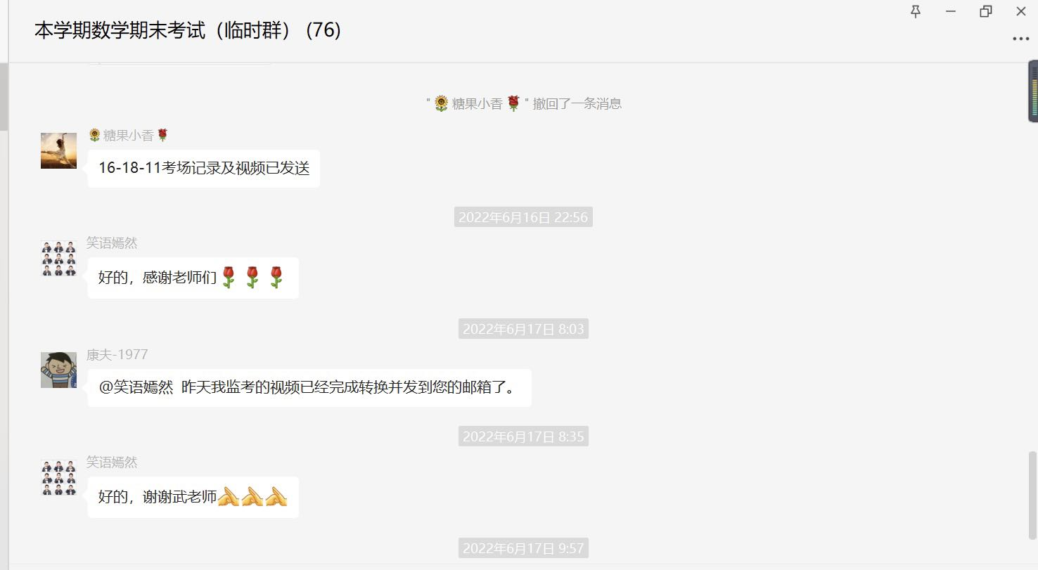 考试过程中,督导办和教务处组成48人的巡考小组,分成10个小组组建巡考群,每天线上巡考;各学院对监考、主考老师组织了培训,成立了期末考试领导小组,组建主考老师群,每天及时解决考试期间相关问题。
