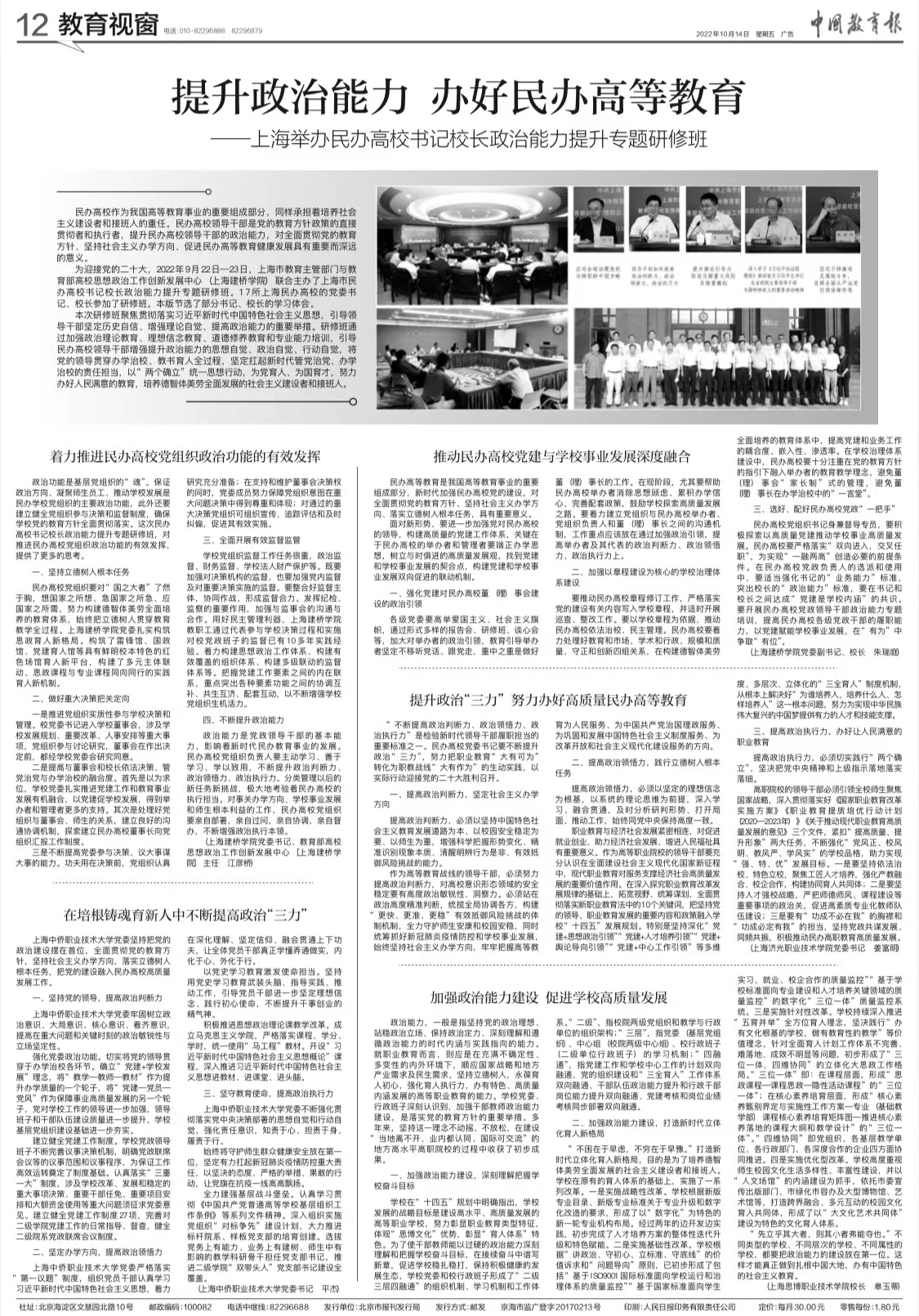 【不久前由上海市民办高校党工委,市教委民办教育处和教育部高校思想政治工作创新发展中心(上海建桥学院)共同组织的上海民办高校书记校长政治能力提升专题专修班在我校举办。10月14日《中国教育报》整版摘登了参加学习的部分书记校长的学习体会。全文如下——】