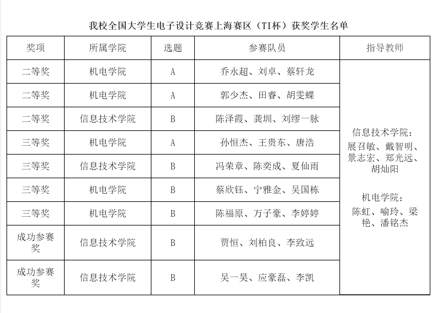 10月13-18日,TI杯上海市大学生电子设计竞赛在上海各参赛学校举行。在本届电子设计竞赛中,我校信息技术学院与机电学院共有9支参赛队参加了本科组2个项目的角逐,经过同学们6天5夜的奋战,最终获得二等奖3项、三等奖4项、成功参赛奖2项的好成绩。