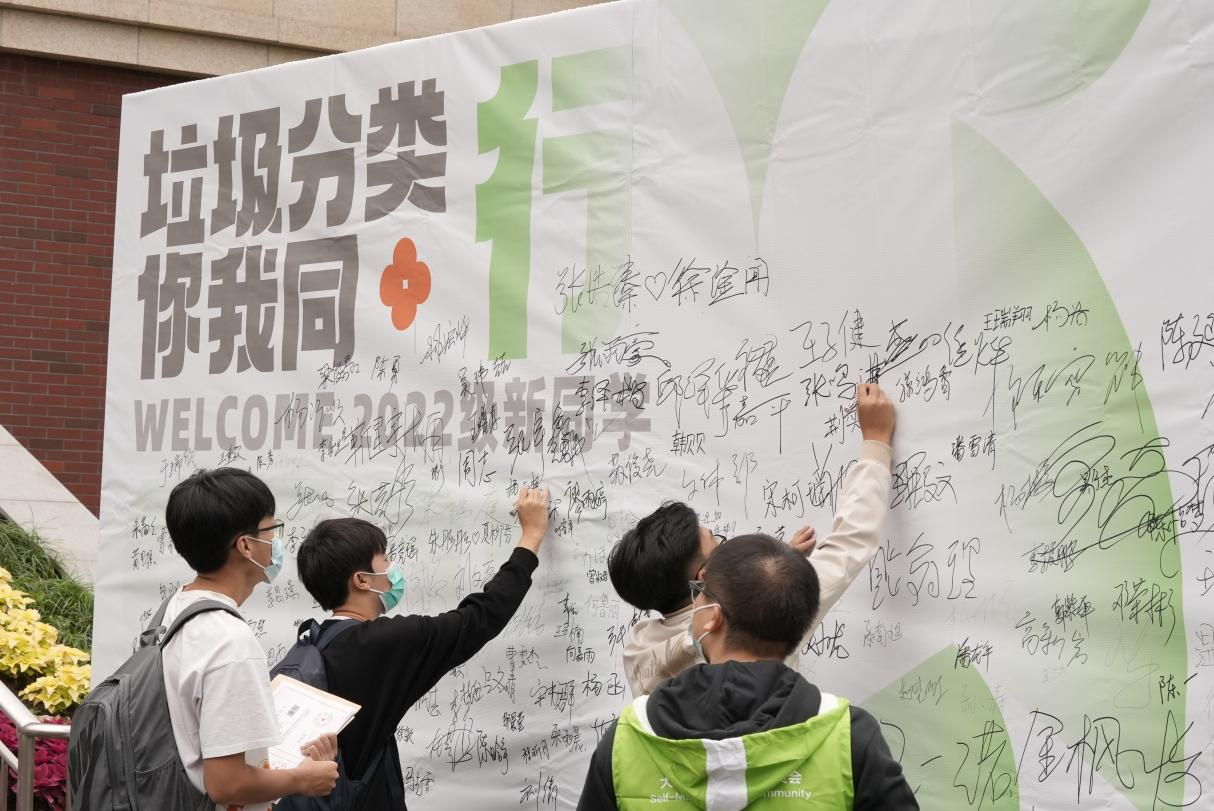 为帮助广大新生了解上海市垃圾分类要求,养成垃圾分类的良好习惯,全面推进垃圾分类工作,进一步加强校园生态文明建设,2022年10月7日至9日,上海建桥学院后勤保卫处在2022级新生报到环节同步开展以“垃圾分类,你我同行”为主题的垃圾分类减量宣传及签名寄语活动。