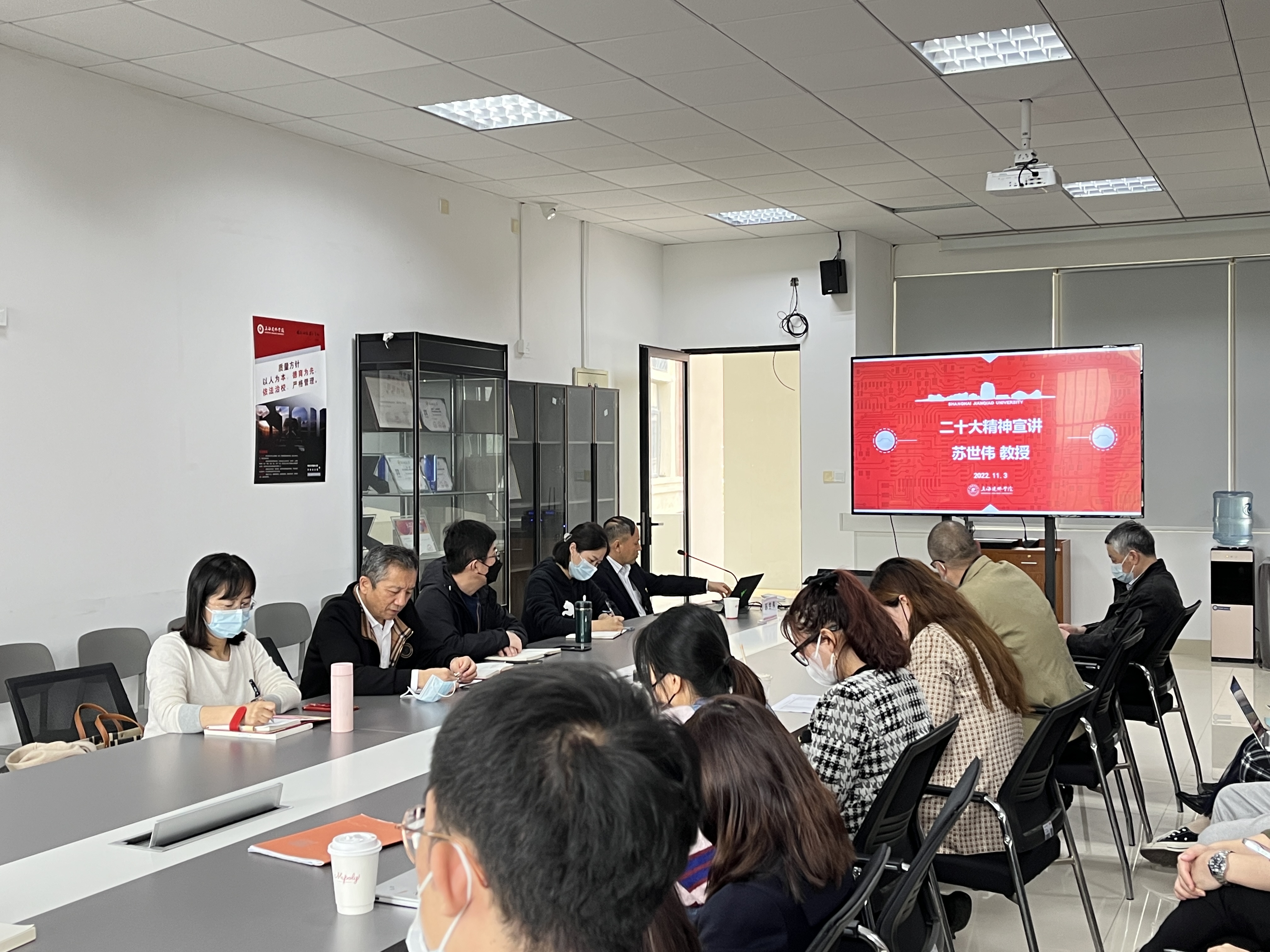 成立学校党的二十大精神理论宣讲团。11月2日上午,我校“学习贯彻党的二十大精神专题辅导报告会暨学校理论宣讲团成立仪式”在图书馆M612室举行。上海市民办高校党工委副书记江鸿波作辅导报告。用摆事实、讲道理的方式,深入阐述了党的二十大的重大意义,讲解了过去五年工作和新时代十年的伟大变革,解读了新时代新征程中国共产党的使命任务,并论述了建设具有强大凝聚力和引领力的社会主义意识形态的十大总体任务。辅导报告会结束后,举行了学校党的二十大精神理论宣讲团成立仪式。学校理论宣讲团由党员校领导、二级党组织书记、马克思主义学院理论宣讲团成员,以及优秀学生骨干组成。宣讲团通过采取线上与线下相结合的辅导报告、主题讲座、专题培训、读书报告会等宣讲形式,在全校师生中开展全覆盖、高质量、全方位宣讲,推动党的二十大精神在师生中入脑入心、落地生根。