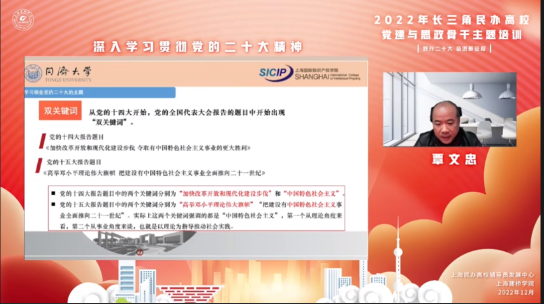 9日下午,有两场报告。上半场,由同济大学上海国际知识产权学院党委书记覃文忠作题为“深入学习贯彻党的二十大精神”的报告。讲座的内容分为八个部分,分别为,第一,学习贯彻党的二十大的重大意义;第二,学习领会党的二十大的主题;第三,深入学习领会过去五年工作和新时代十年伟大变革的重大意义;第四,深入学习领会习近平新时代中国特色社会主义思想的世界观和方法论;第五,深入学习领会以中国式现代化全面推进中华民族伟大复兴的使命任务;第六,深入学习领会对未来五年党和国家各项事业发展的战略部署;第七,深入学习领会以党的伟大自我革命引领伟大社会变革的重要要求;第八,深入学习领会发扬斗争精神、增强斗争本领、坚持团结奋斗的时代要求。